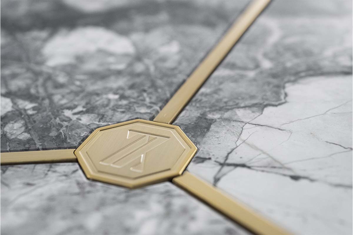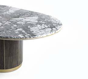 Top in compensato impiallacciato o gres. Sottopiano rinforzato da telaio in metallo rivestito in tessuto touch. Basamento in multistrato curvo in essenza o laccato, con base e inserti verticali in metallo.