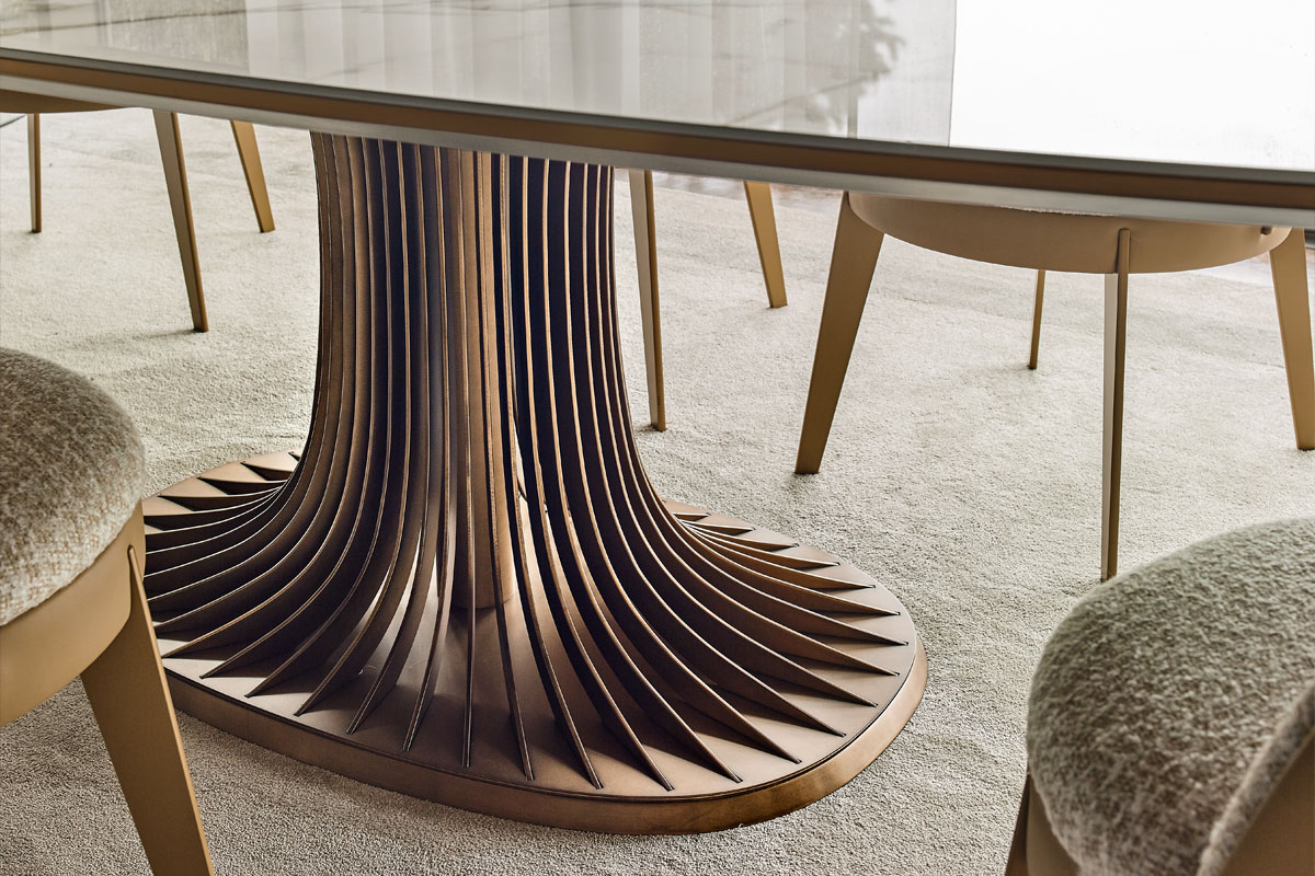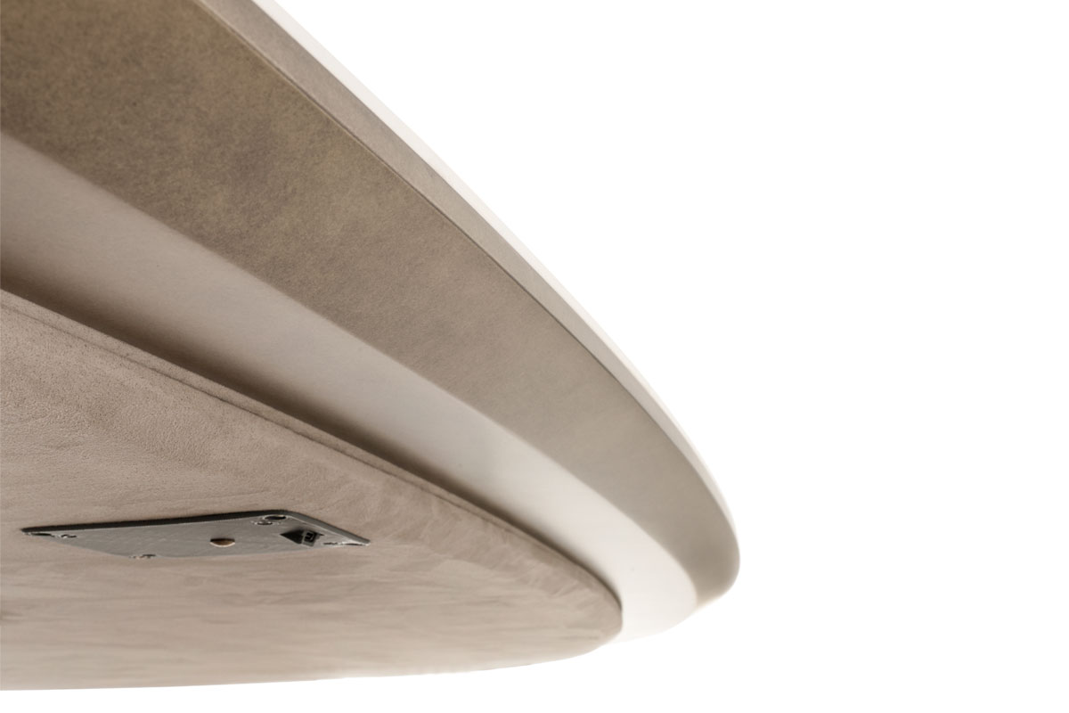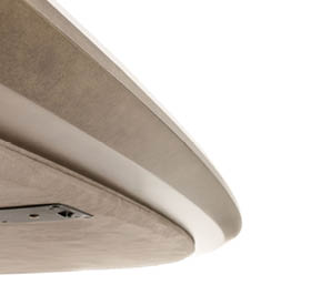 Top in compensato impiallacciato o gres. Sottopiano rinforzato da telaio in metallo rivestito in tessuto touch. Basamento composto da lamelle con pilastro centrale e base in metallo verniciato. Opzionale luce led nel basamento con ricarica tramite power bank.