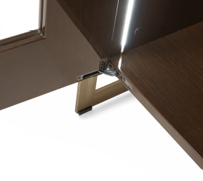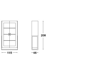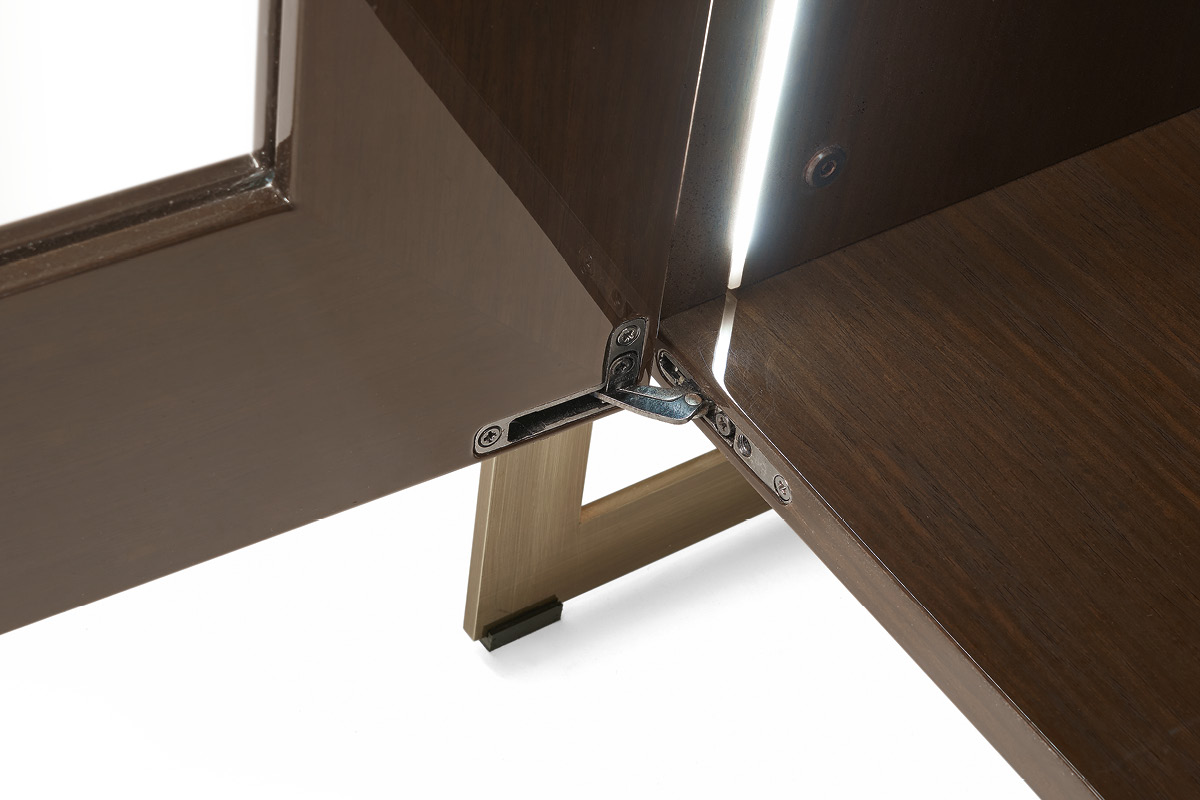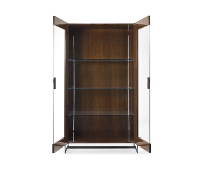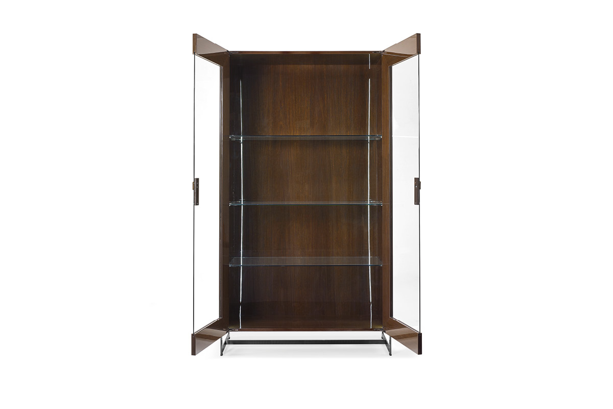 Mobile con struttura in legno laccato o in essenza. Parte inferiore dei fianchi esterni in legno laccato con lavorazione cannetté. Struttura esterna in metallo e ante in cristallo con chiusura soft. Interni corredati da tre ripiani in cristallo molato regolabili in varie posizioni, luci a led. Linterno della vetrina può essere in legno o in tessuto manopesca.