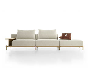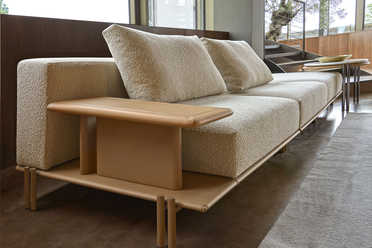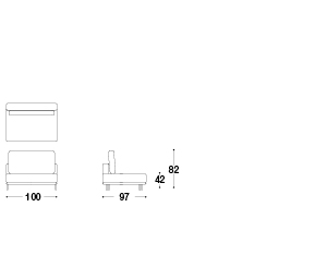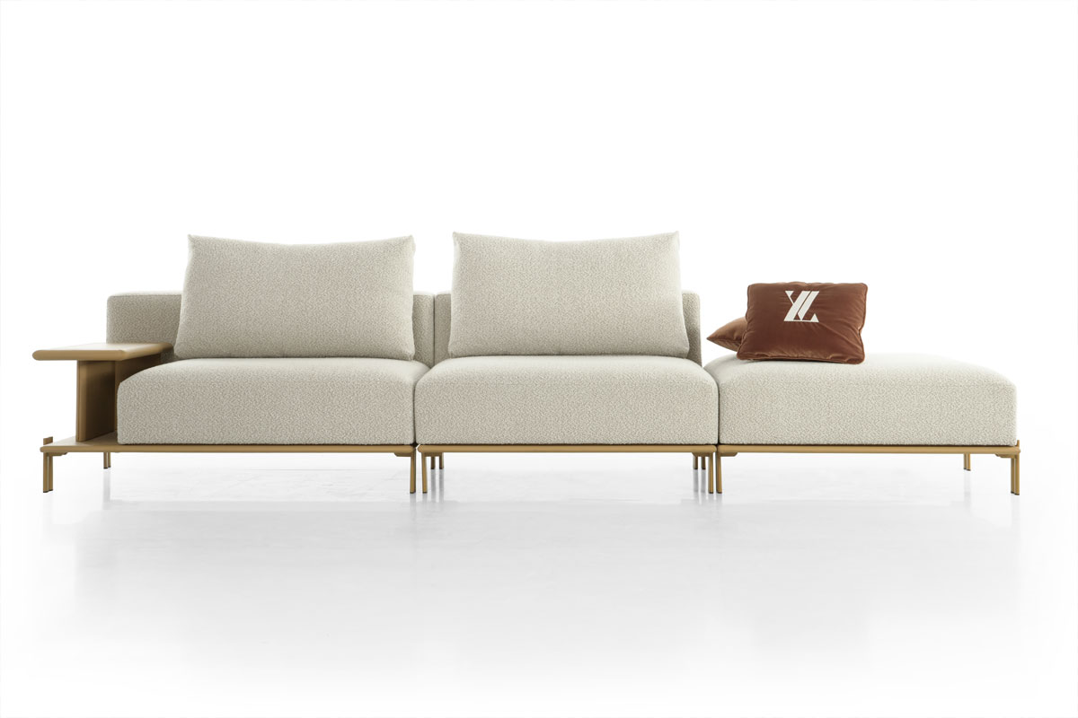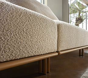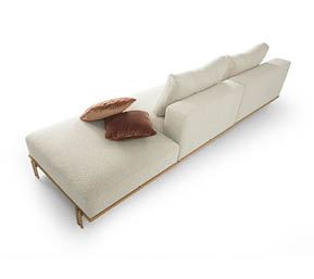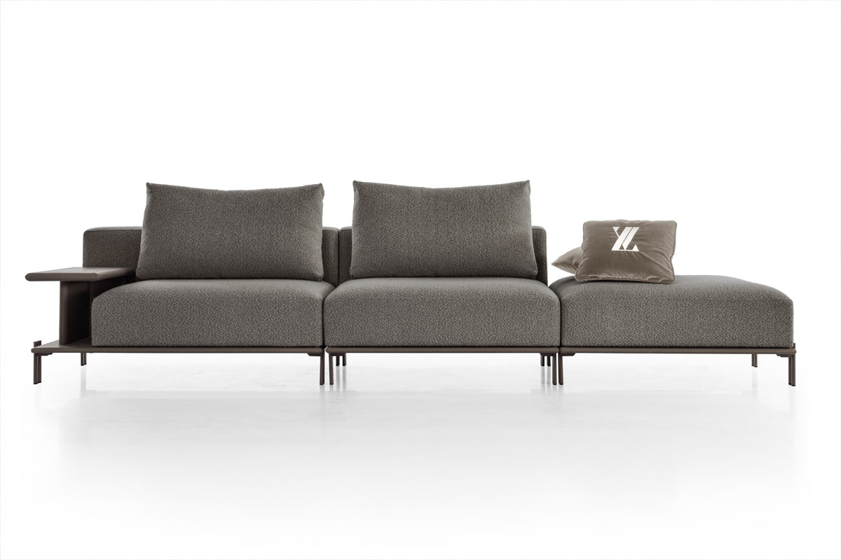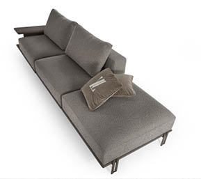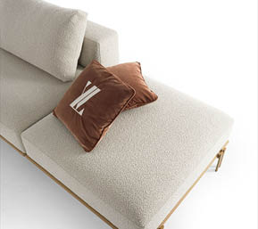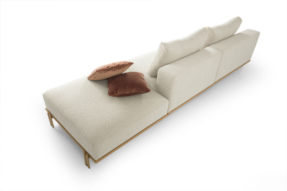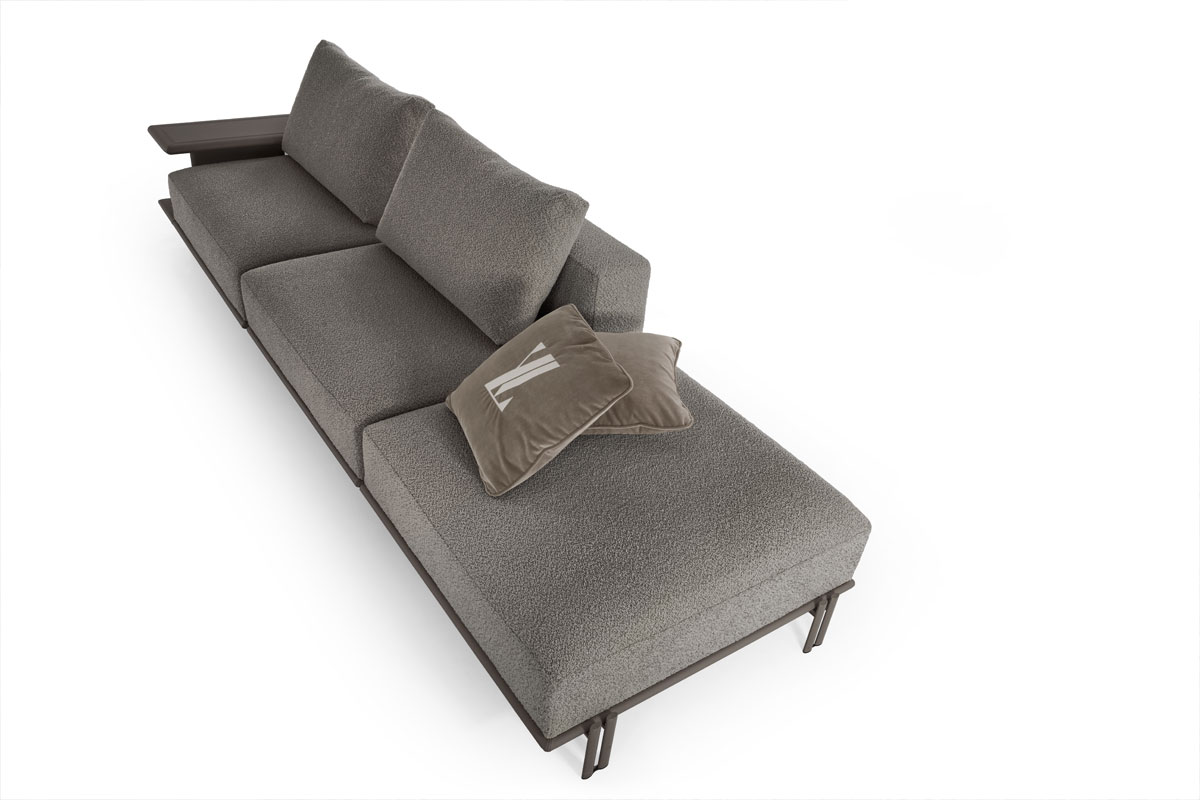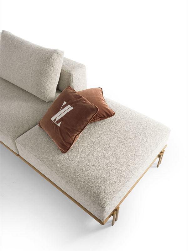 Divano componibile con struttura in multistrato. Imbottito con gomme di varie densità . Strato superiore in Air Soft ricoperto con falda su tutta la superficie. Strato della seduta superiore in gomma Memory da 3cm. Seduta con cinghie elastiche, piedi in legno verniciato con effetto metallo.