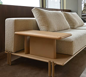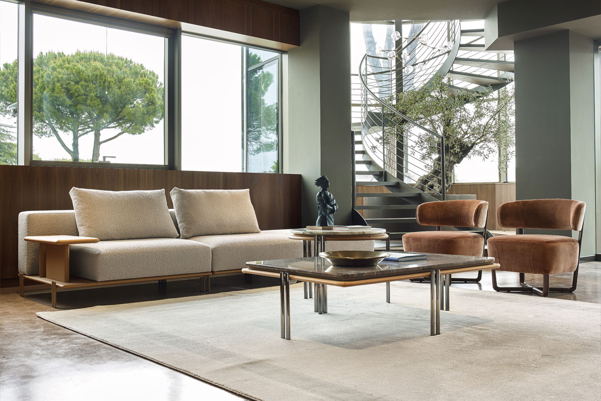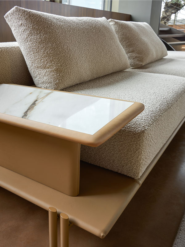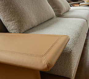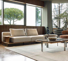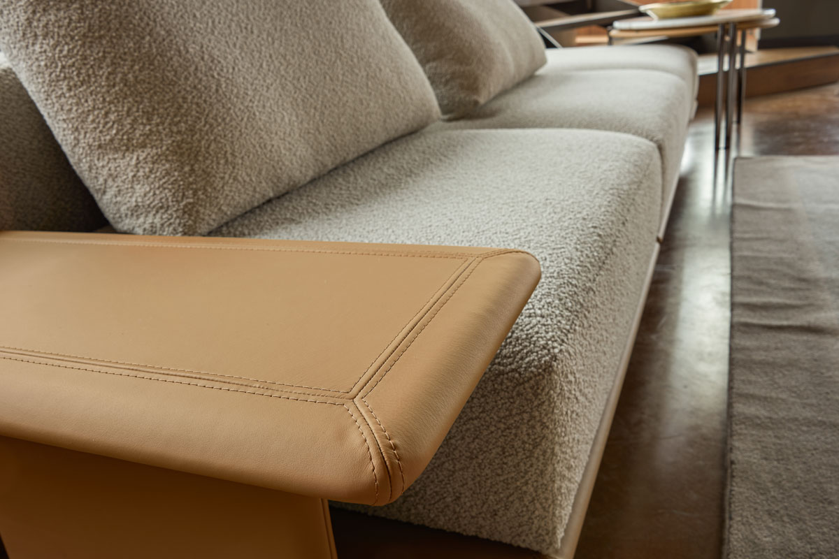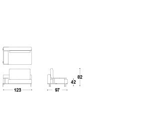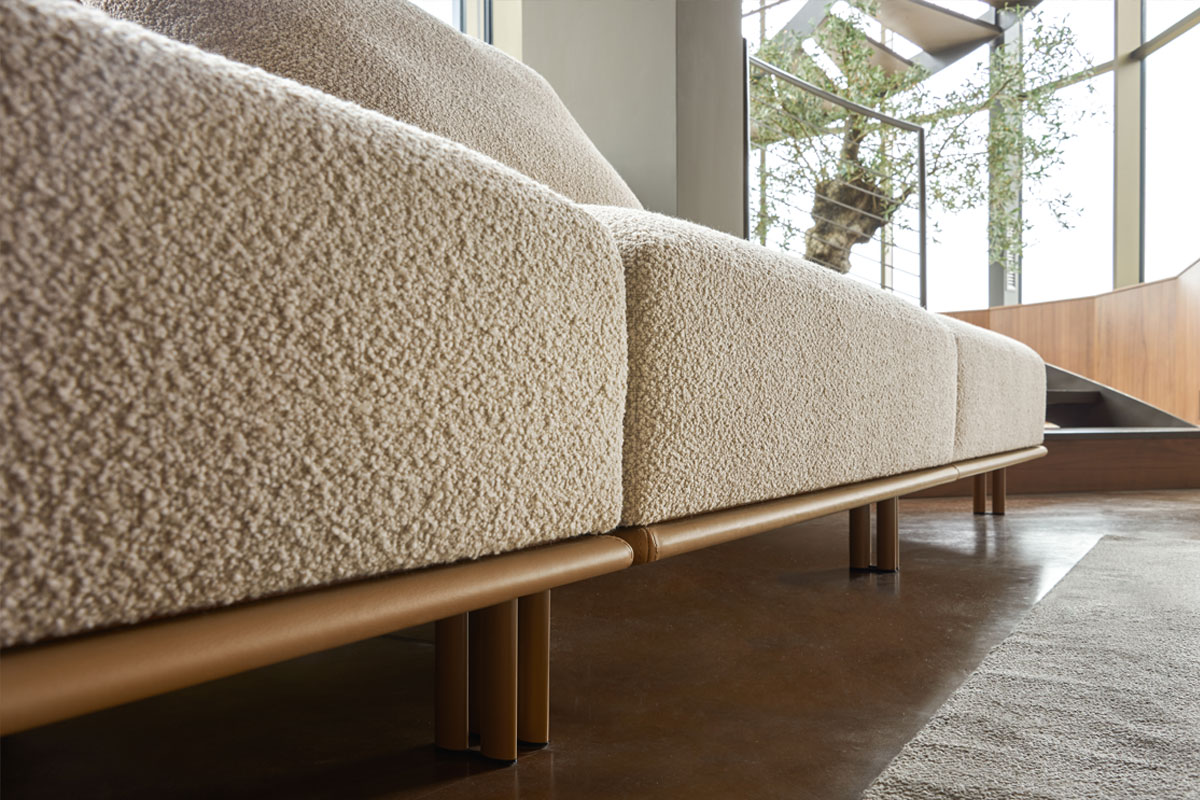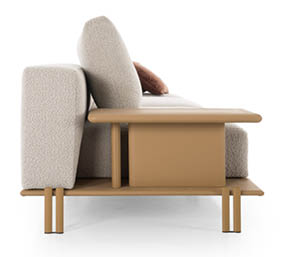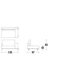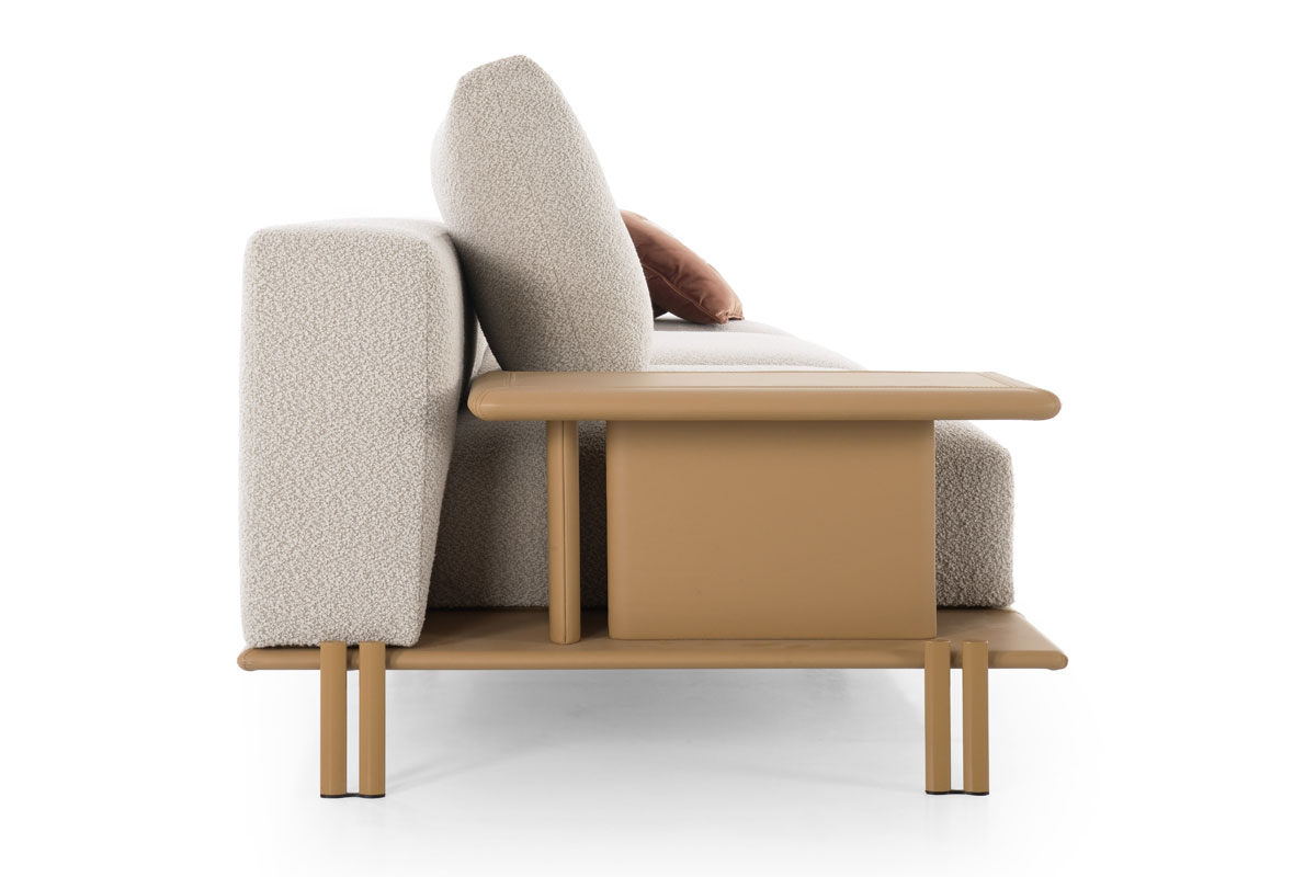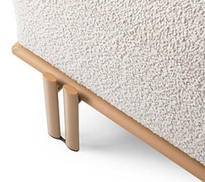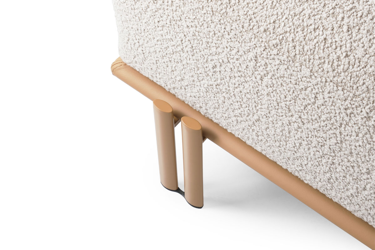 Divano componibile con struttura in multistrato. Imbottito con gomme di varie densità . Strato superiore in Air Soft ricoperto con falda su tutta la superficie. Strato della seduta superiore in gomma Memory da 3cm. Seduta con cinghie elastiche, piedi in legno verniciato con effetto metallo.