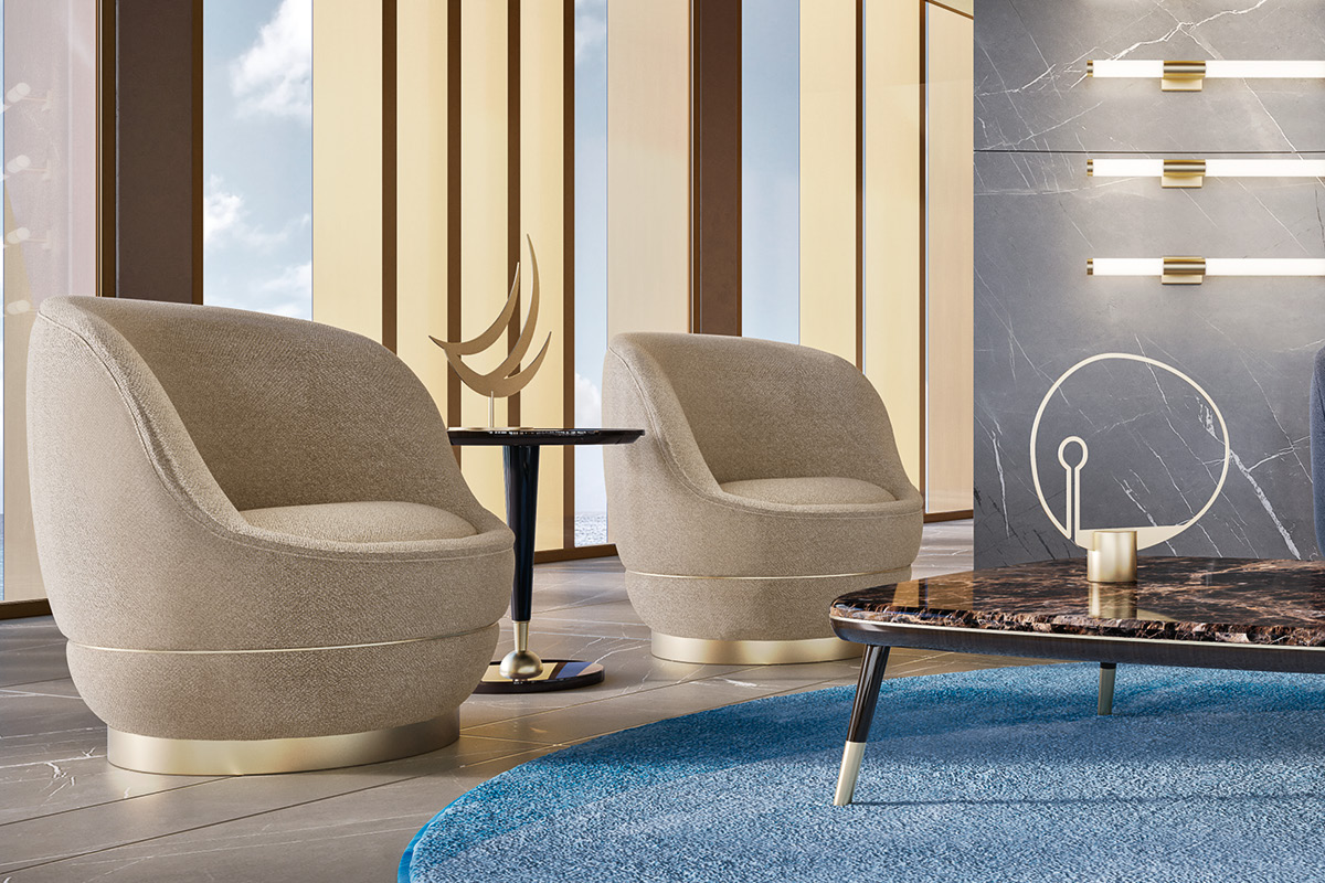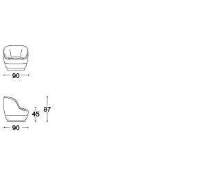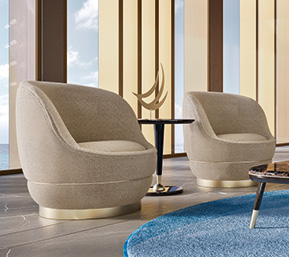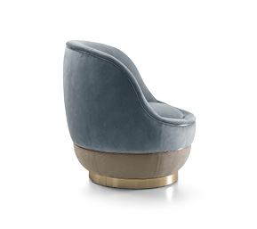 Struttura realizzata in legno massello e in compensato curvo, completamente rivestito in tessuto o pelle. Base in acciaio inox cromato, profili di pelle effetto cromo. Seduta rigida.
