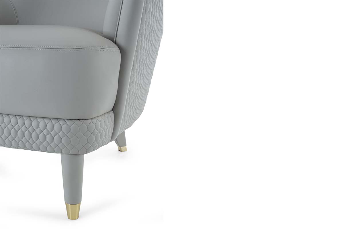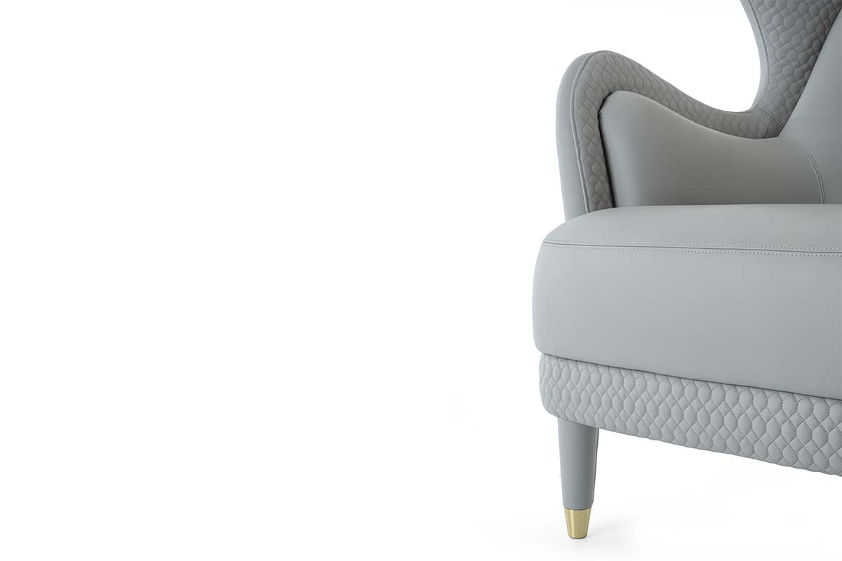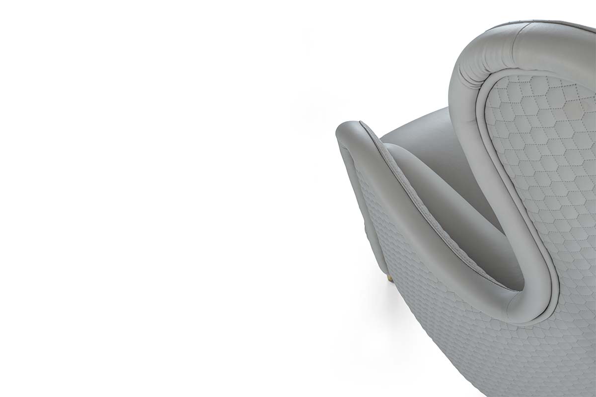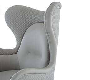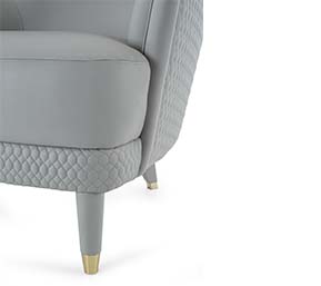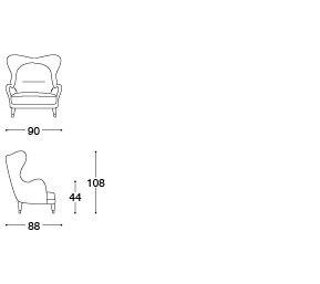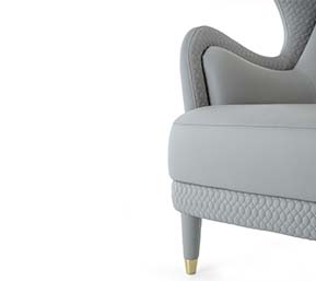 Struttura realizzata in compensato di legno curvo. Completamente rivestita in tessuto o pelle. Piedini con parte terminale in metallo.