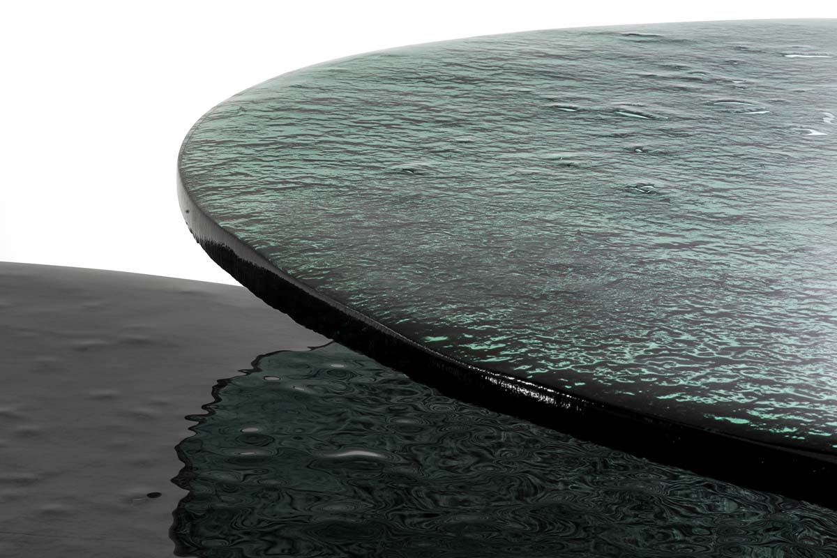 Piano in vetro fuso colorato Base curva in metallo.