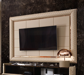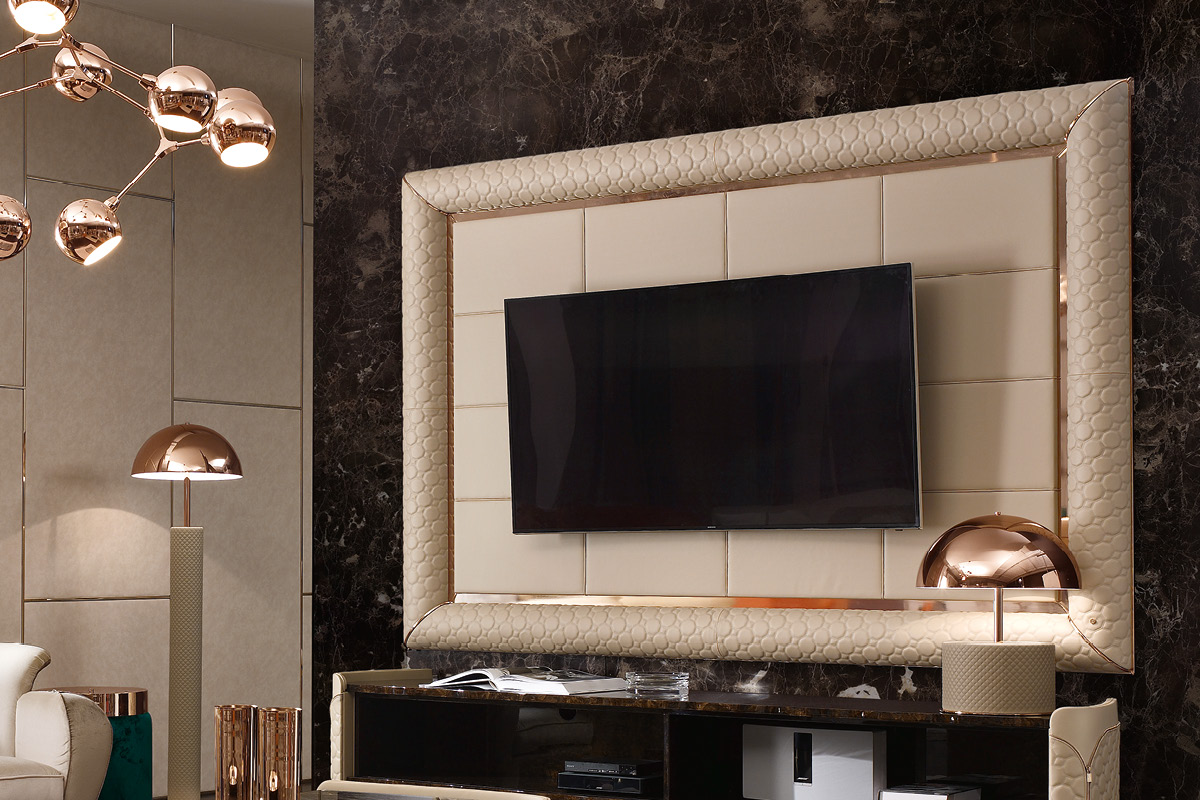 Pannello porta TV completamente rivestito in tessuto o in pelle. Inserti in metallo. Foro centrale passacavi.