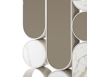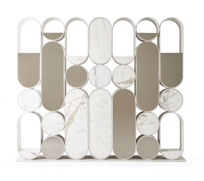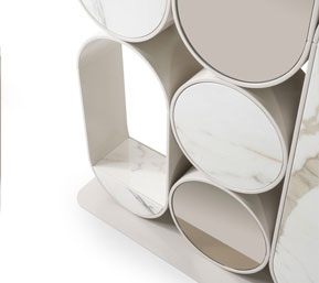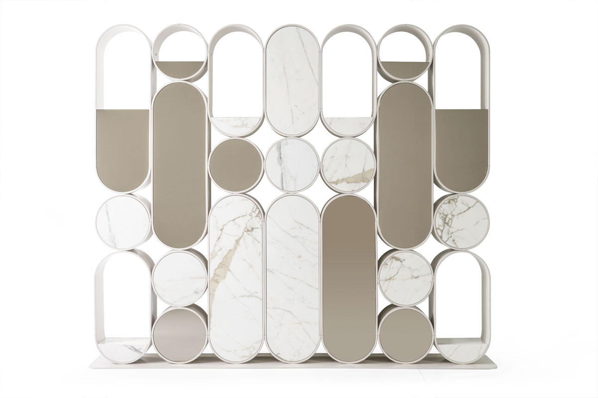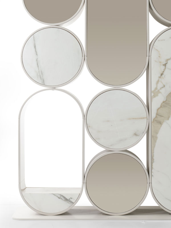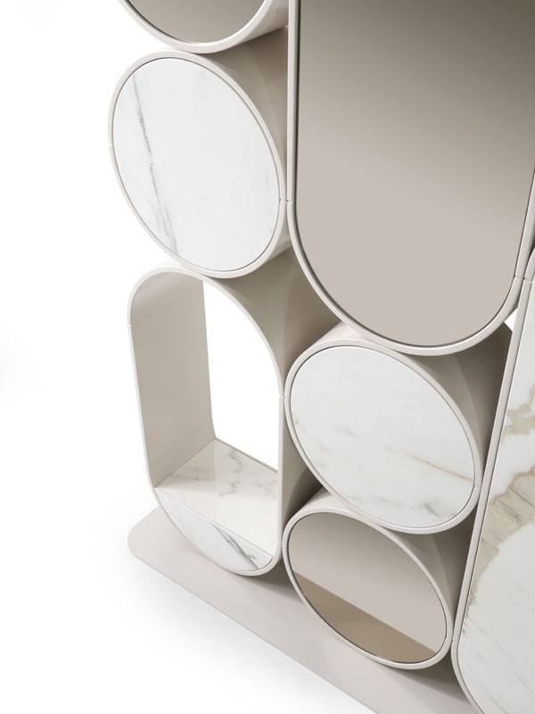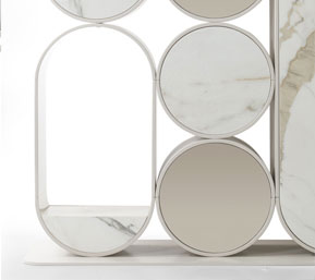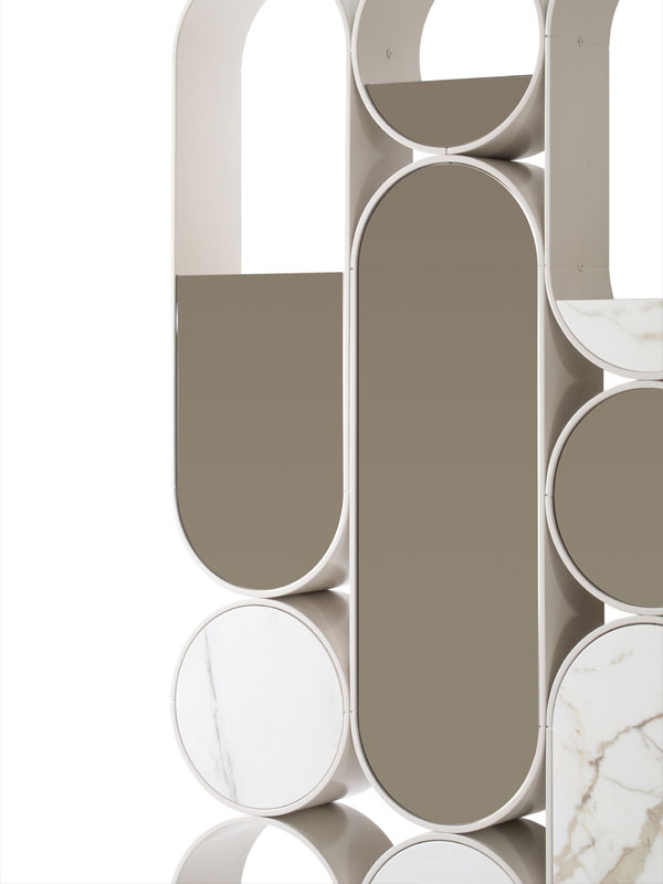 Libreria con ripiani in compensato di legno realizzabili in essenza o laccato. Sono uniti per mezzo di montanti in ottone.