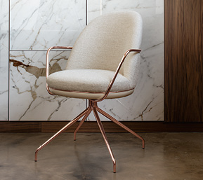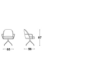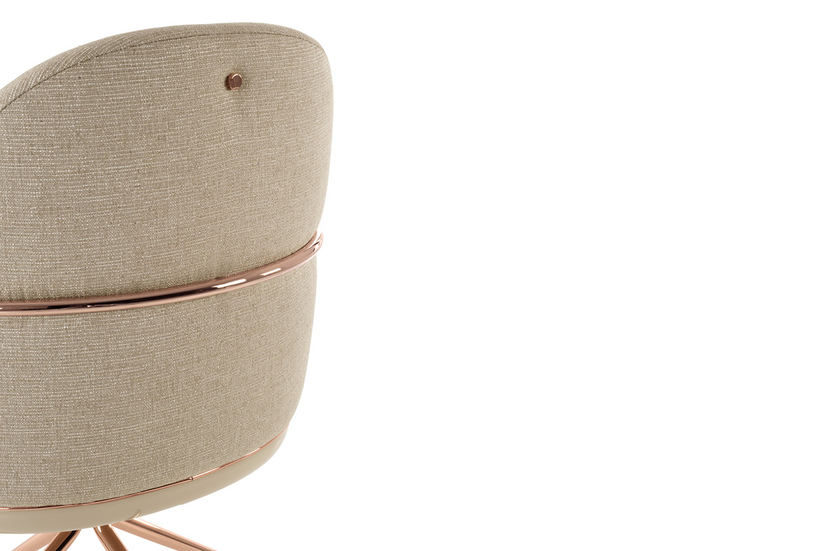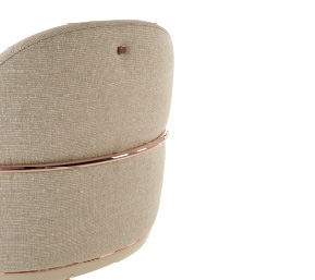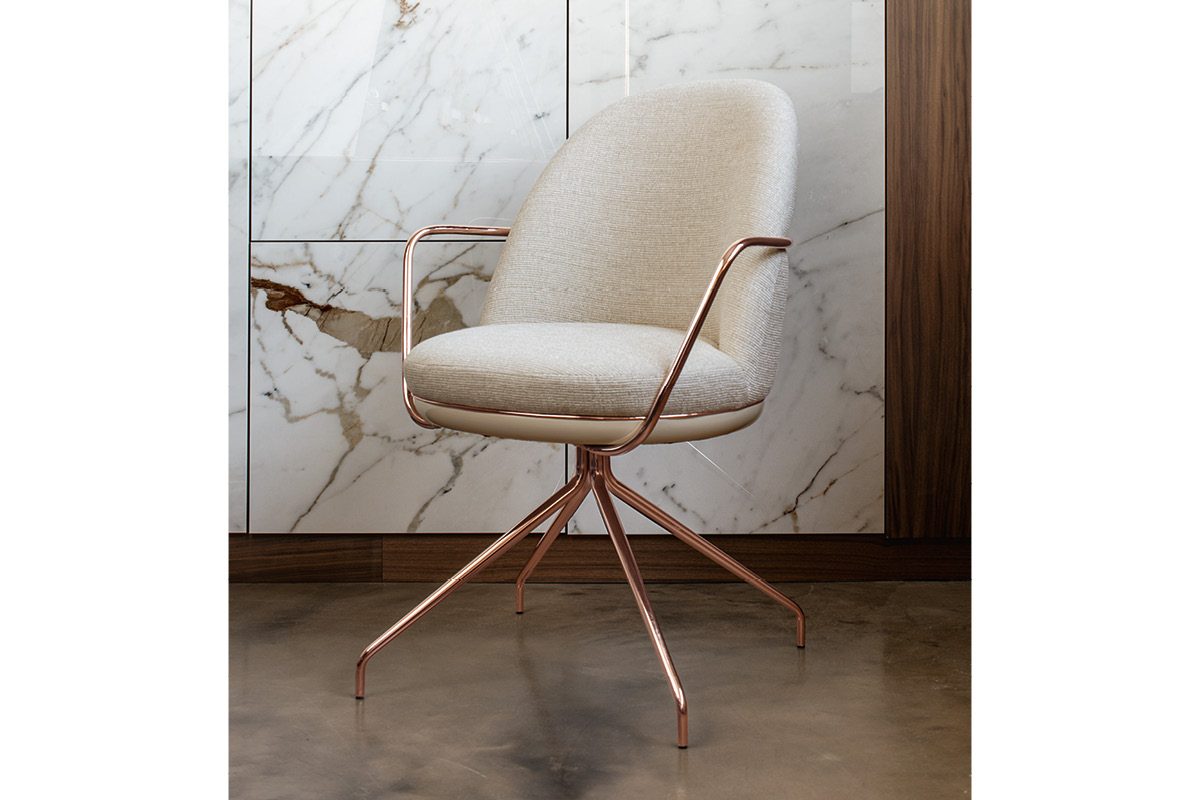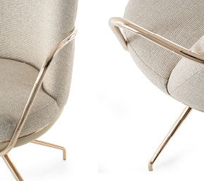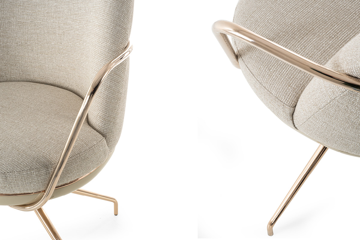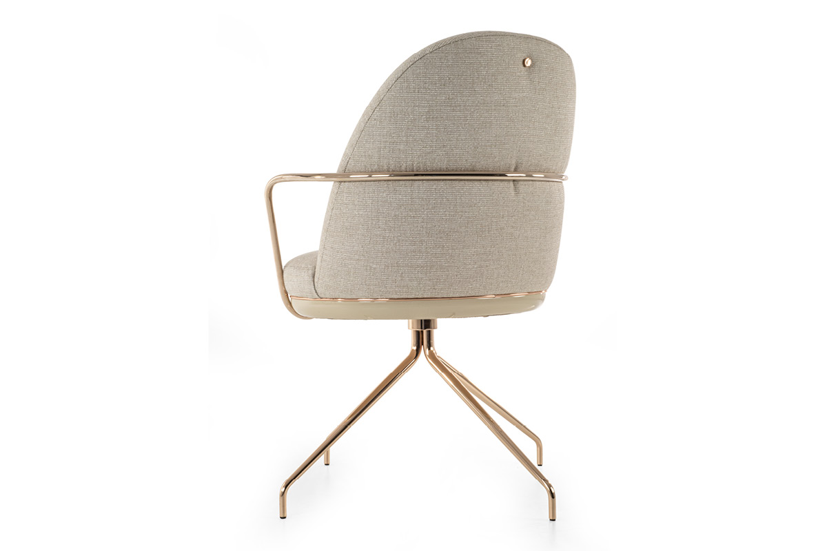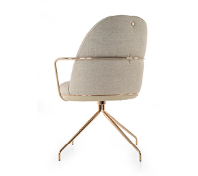 Poltroncina con telaio in legno e schienale curvo. Braccioli e piedi in metallo. Meccanismo ruotante in acciaio. Questo articolo non รจ disponibile in essenza mirto.