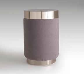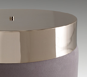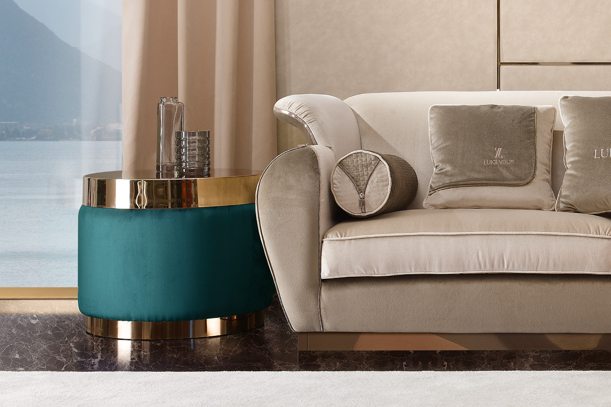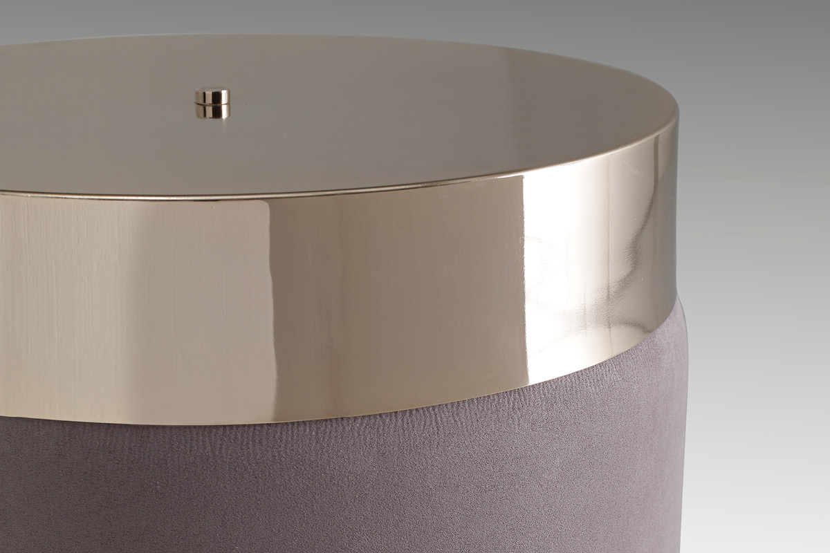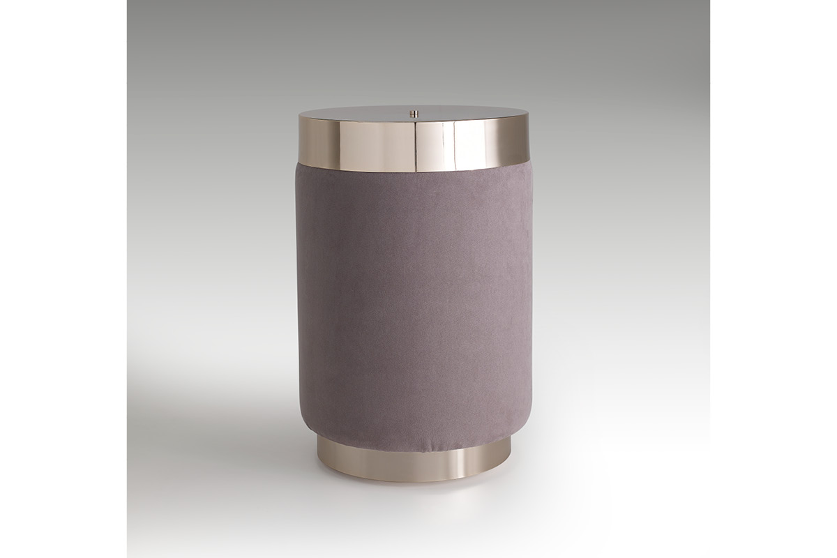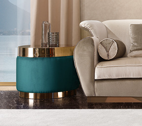 Tavolino con struttura in legno rivestito in tessuto o in pelle. Top e base in metallo. Ruote interne.