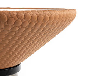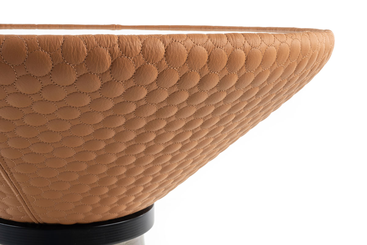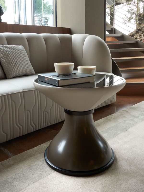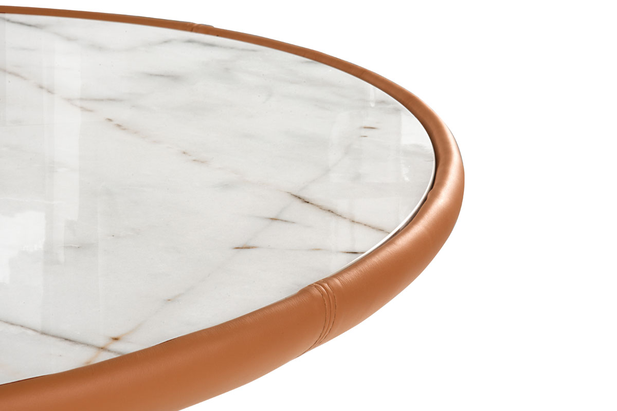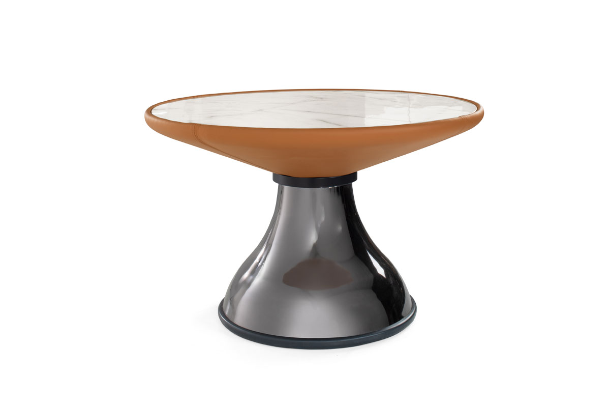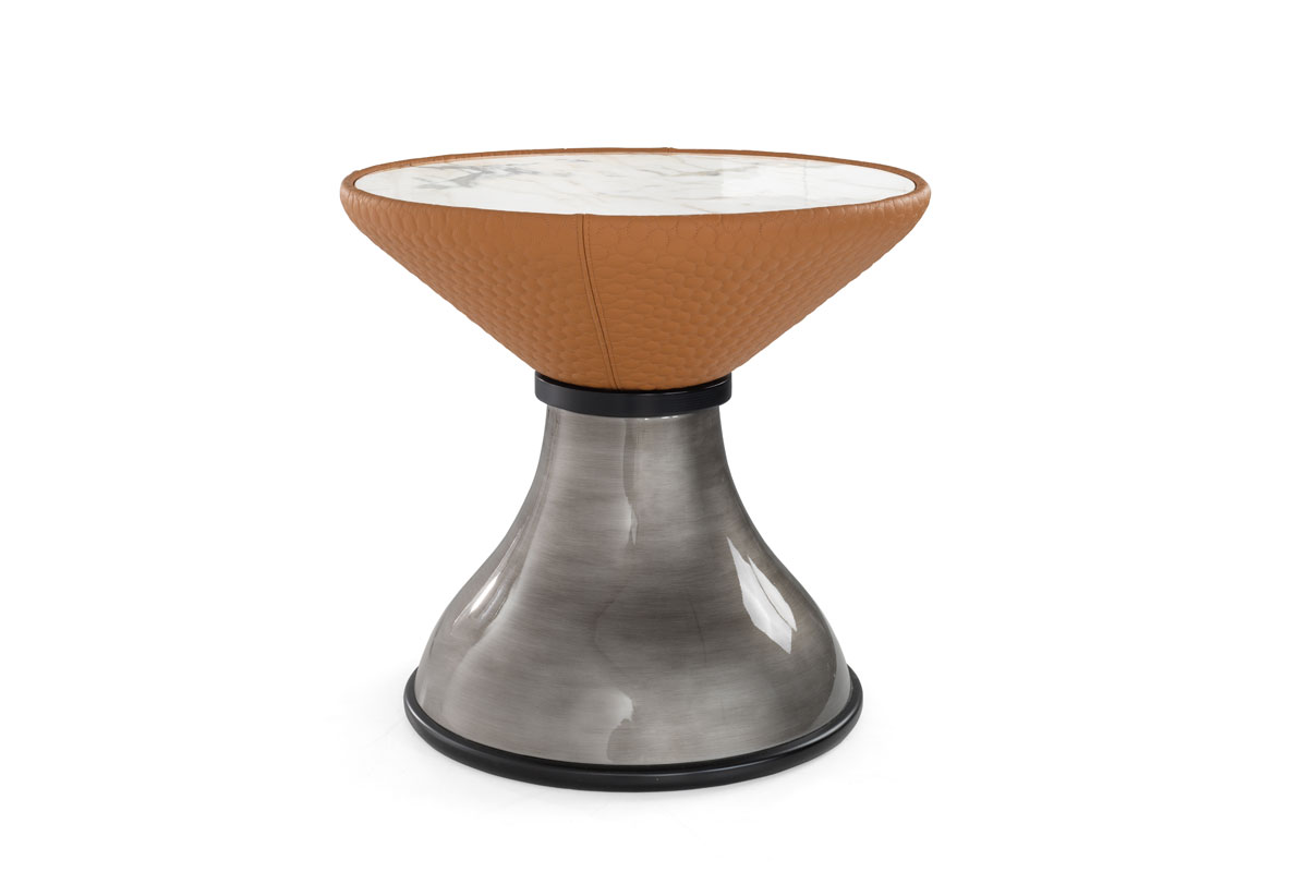 Top in compensato impiallacciato o gres. Parte superiore del basamento in multistrato curvo rivestito in tessuto o pelle, e parte inferiore in metallo