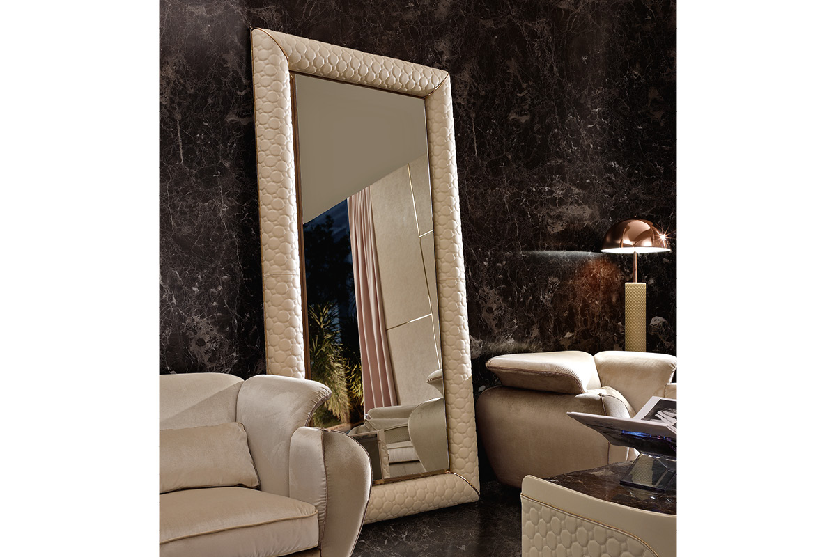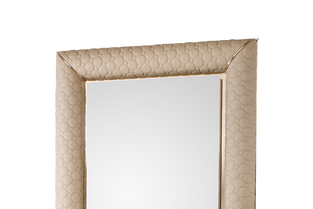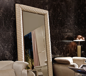 Specchiera con telaio in legno rivestito in tessuto o in pelle. Particolari in metallo.