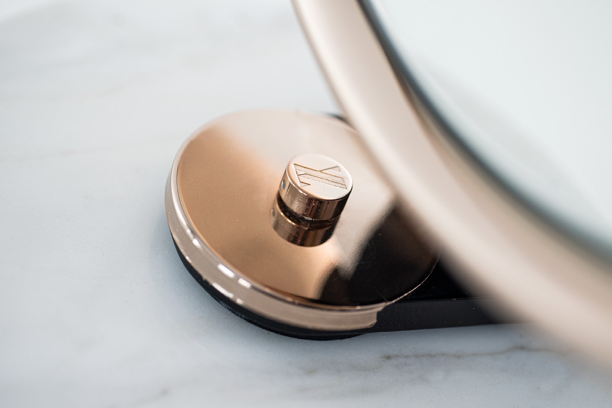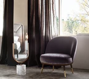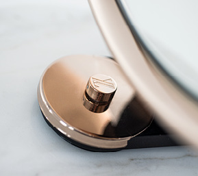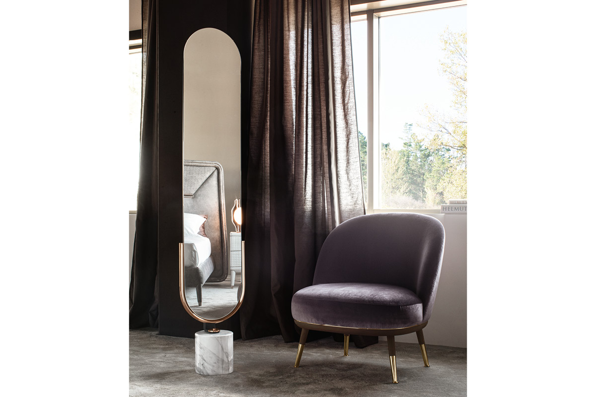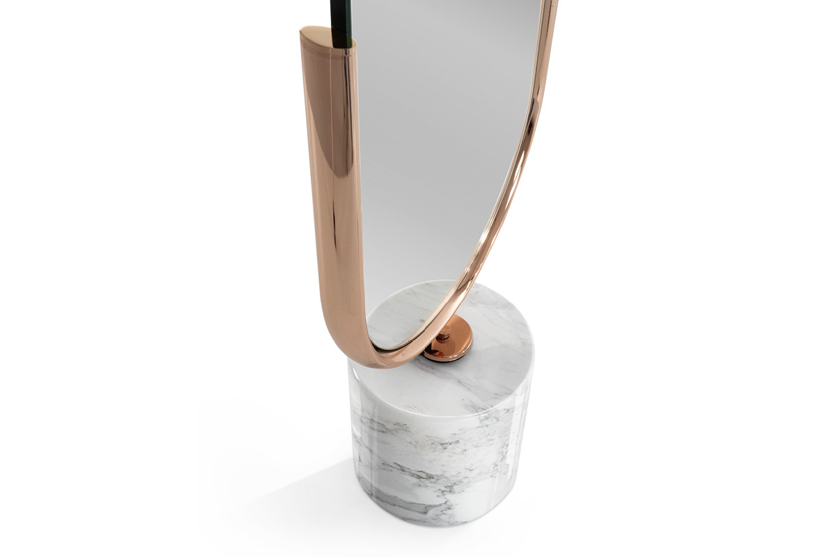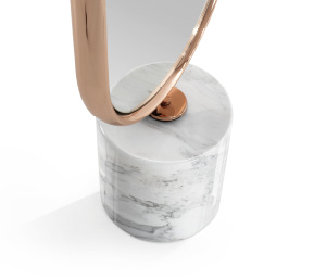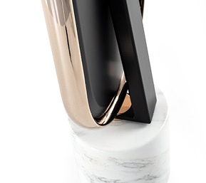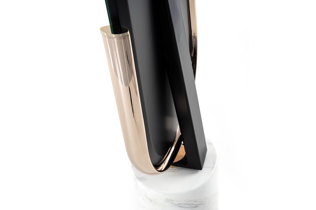 Struttura in pannelli di legno laccato con inserti in metallo di forma ellittica. Base in marmo (Bianco Carrara o Emperador dark)