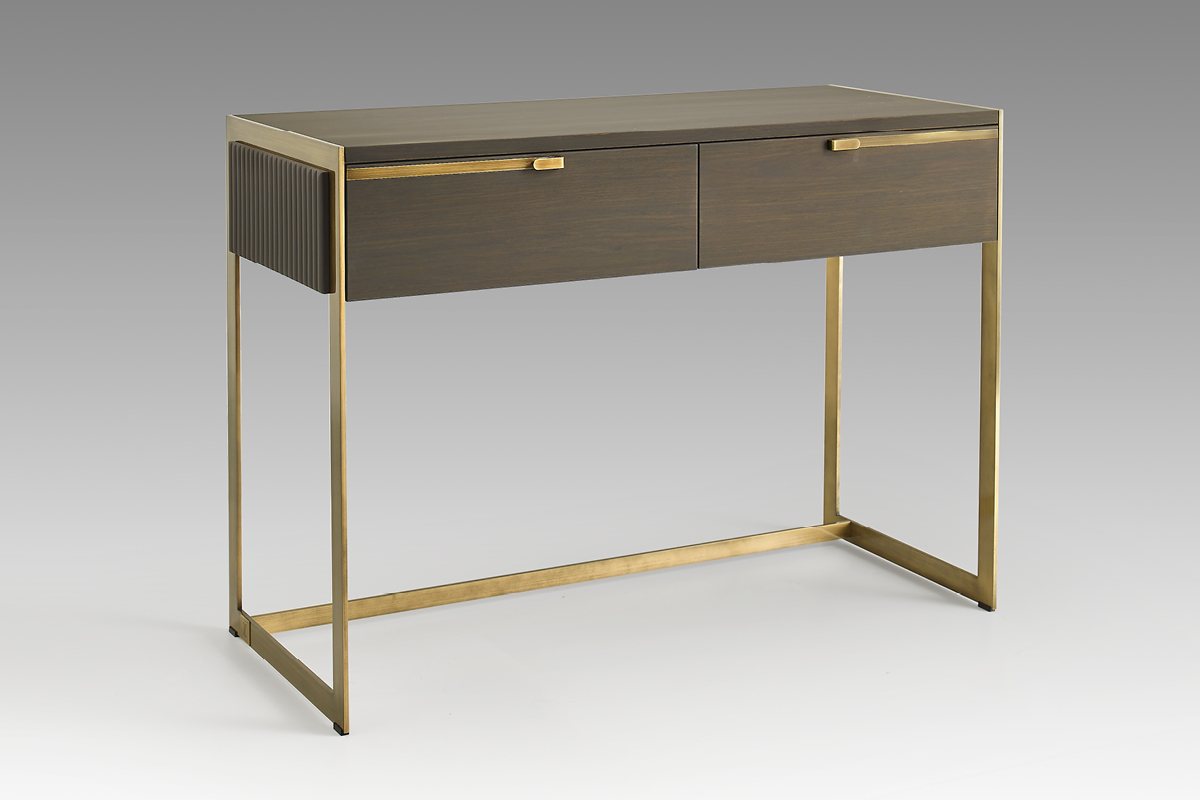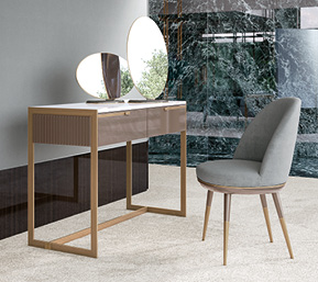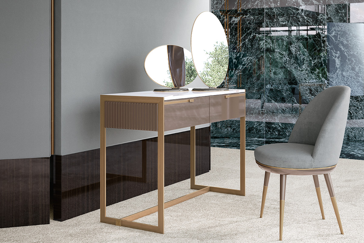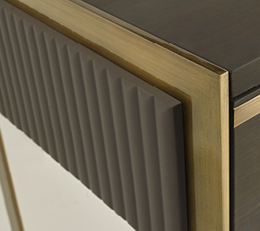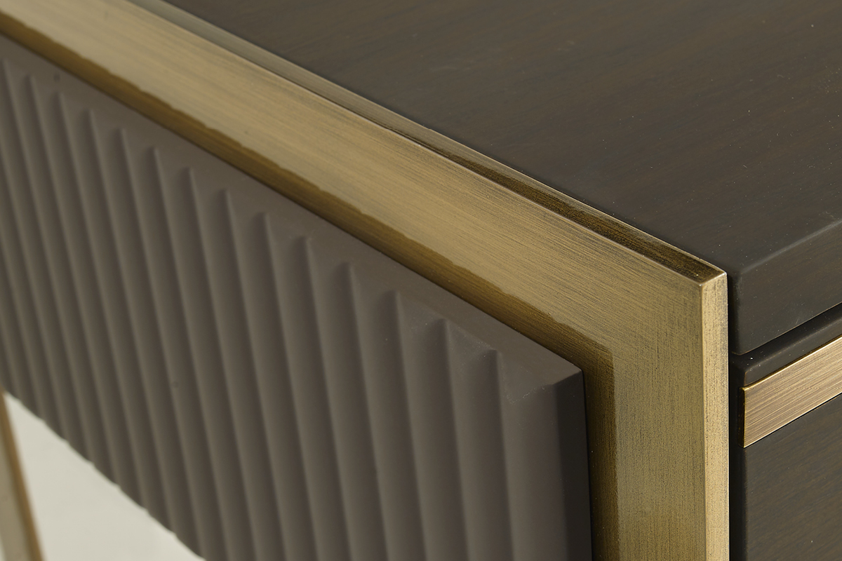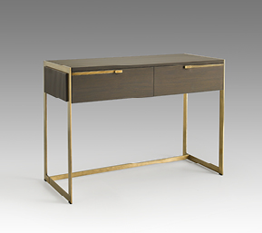 Struttura in compensato di legno laccato o essenza. Fianchi in legno laccati con lavorazione cannetté. Struttura esterna in metallo. Cassetti con chiusura soft. Il piano può essere in legno, in essenza o laccato.