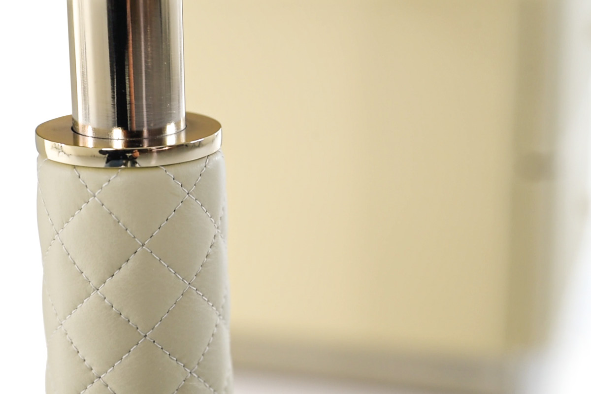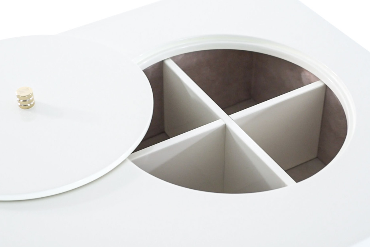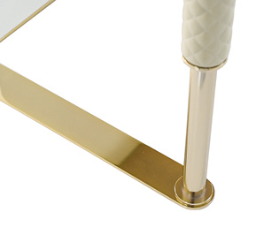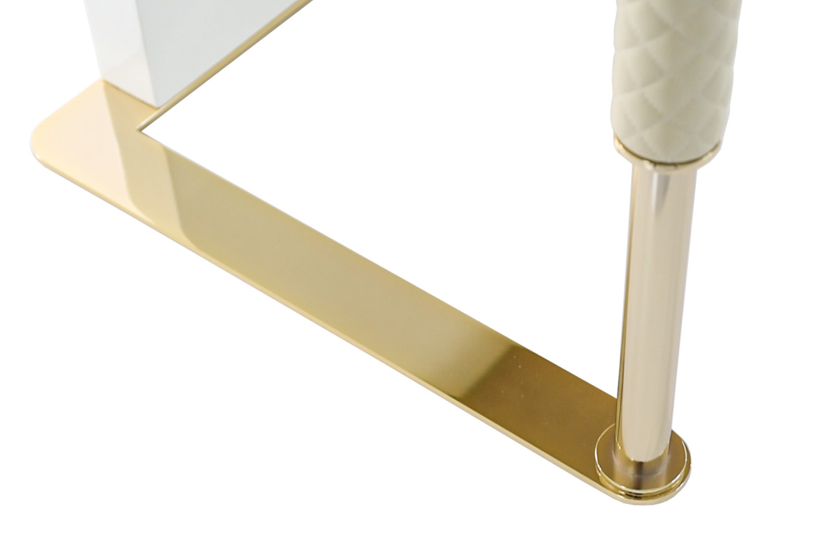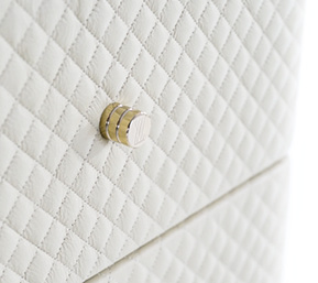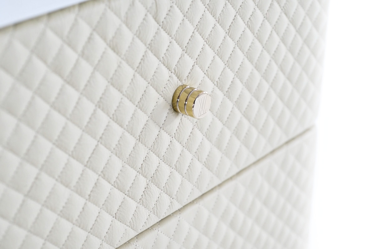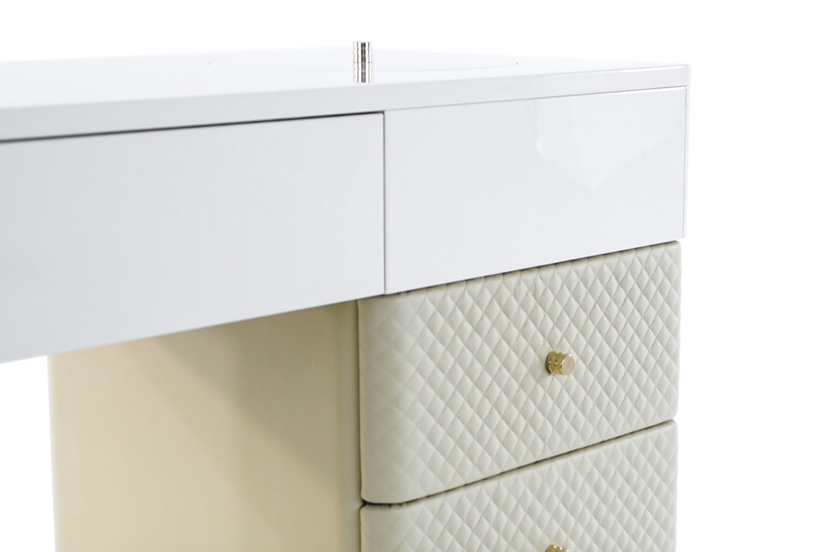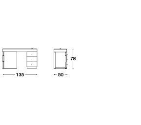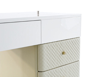 Struttura in compensato, cassettiera laterale interamente rivestita in tessuto o pelle. Piano dÂ’appoggio con cassetto frontale e porta oggetti su top. Base e dettagli in metallo. Cassetti con chiusura soft.