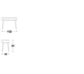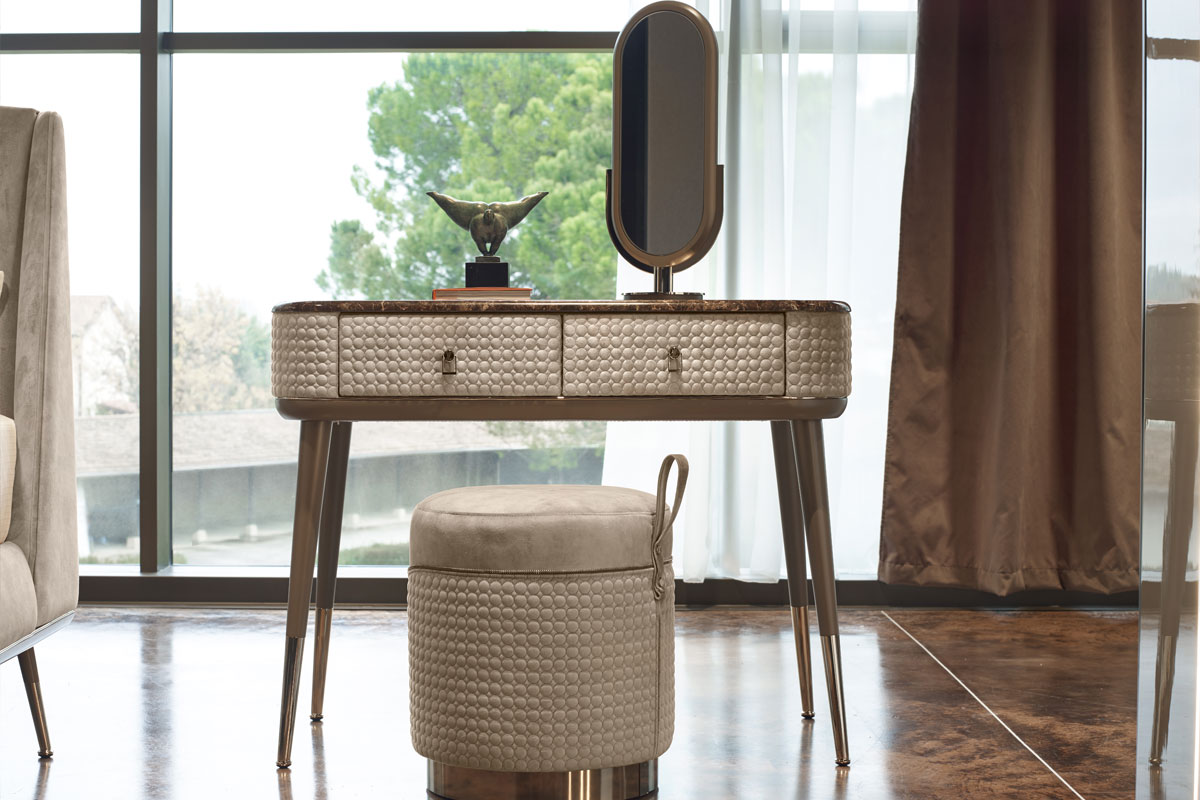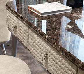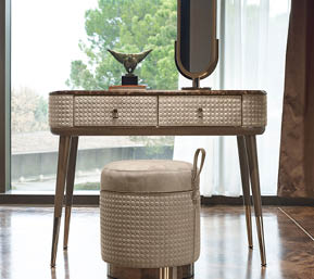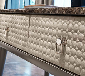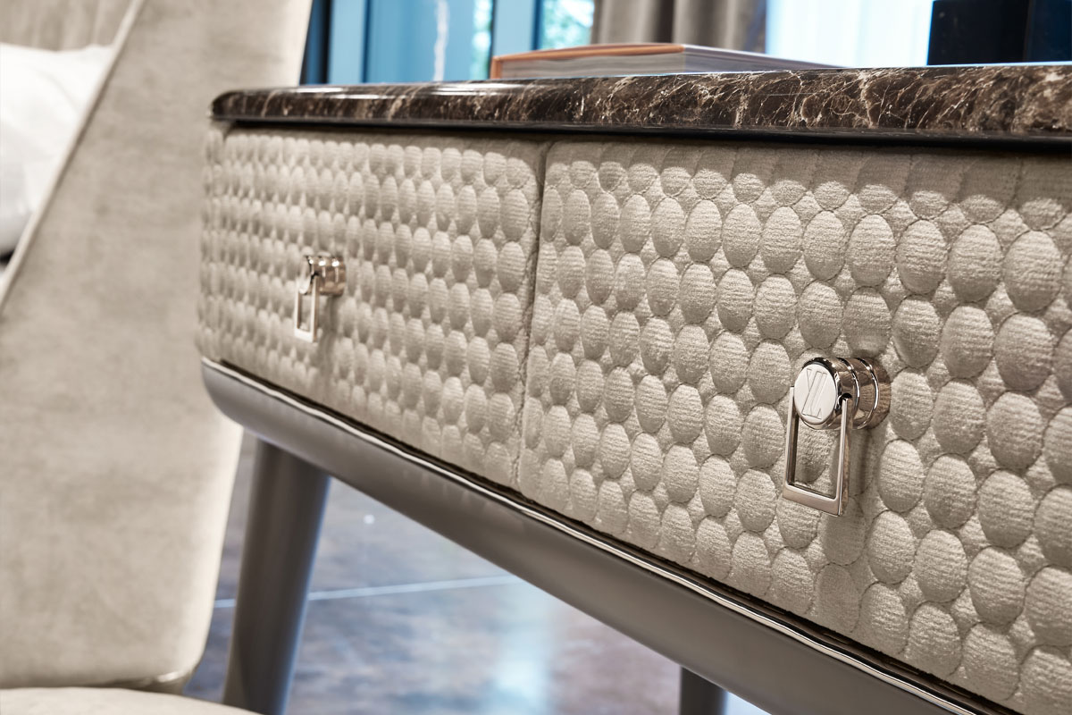 Mobile realizzato in legno. La parte della cassettiera è rivestita in tessuto o in pelle. Base in noce canaletto o laccata. Piano superiore in legno o gres. Cassetto con chiusura soft. Particolari in metallo ed in pelle effetto metallo. Questo articolo non è disponibile in essenza Mkirto.