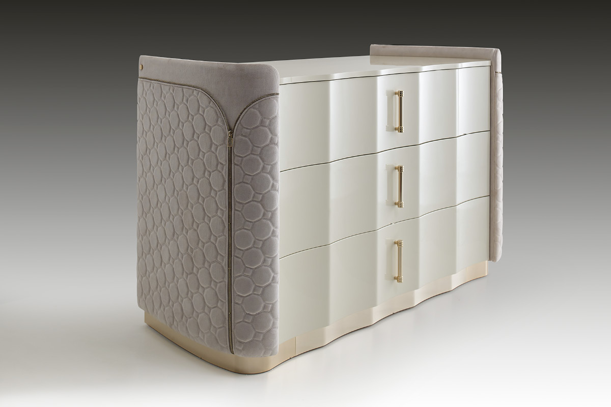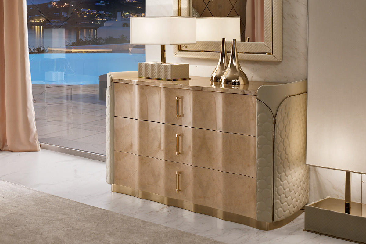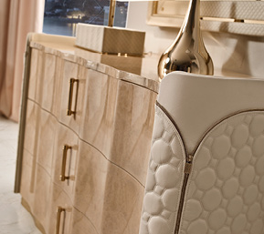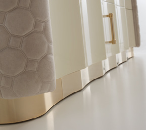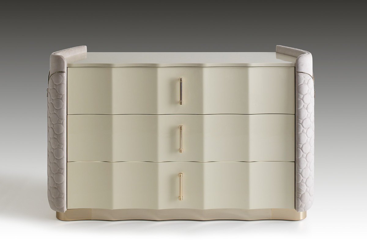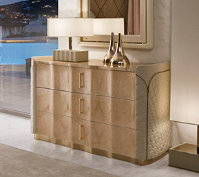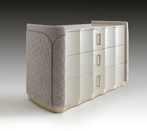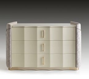 Mobile in legno.I frontali dei cassetti realizzati in essenza o in legno laccato. Cassetti con interni imbottiti e chiusura soft. Fianchi curvi in legno rivestiti in pelle. Base mossa in metallo. Il piano superiore può essere in essenza, legno laccato o gres.