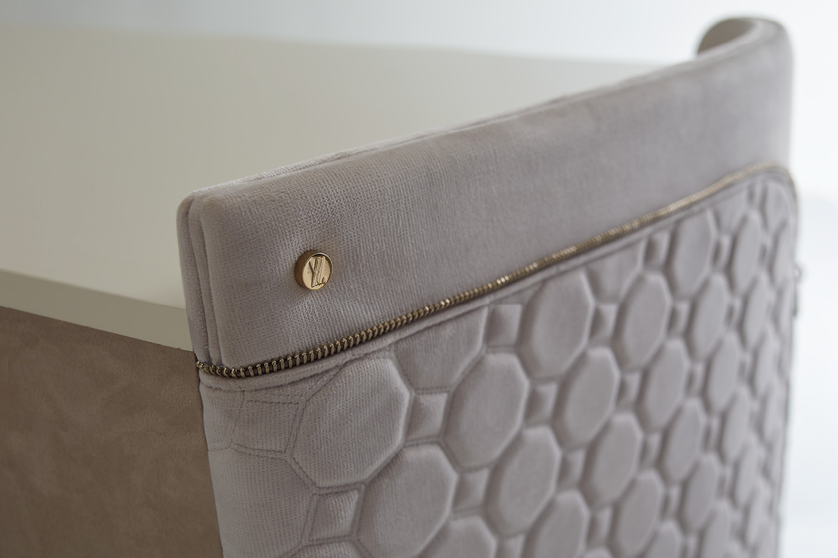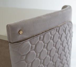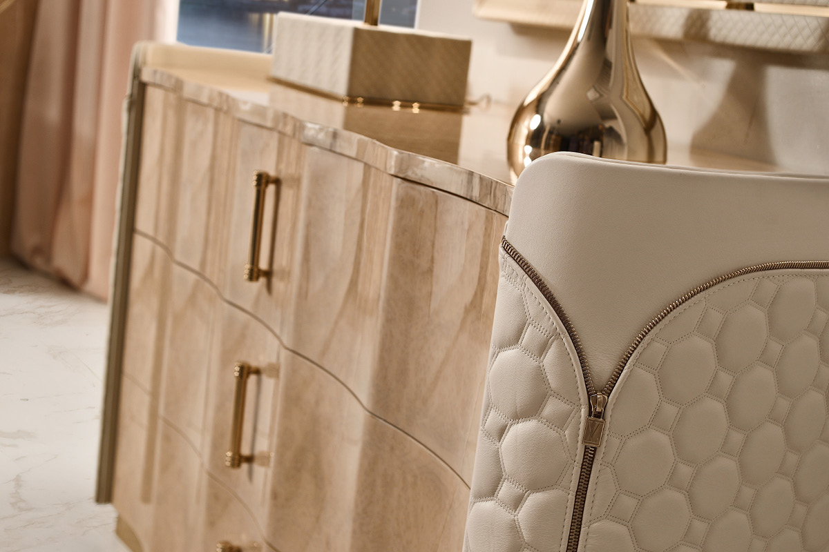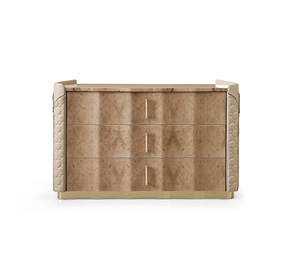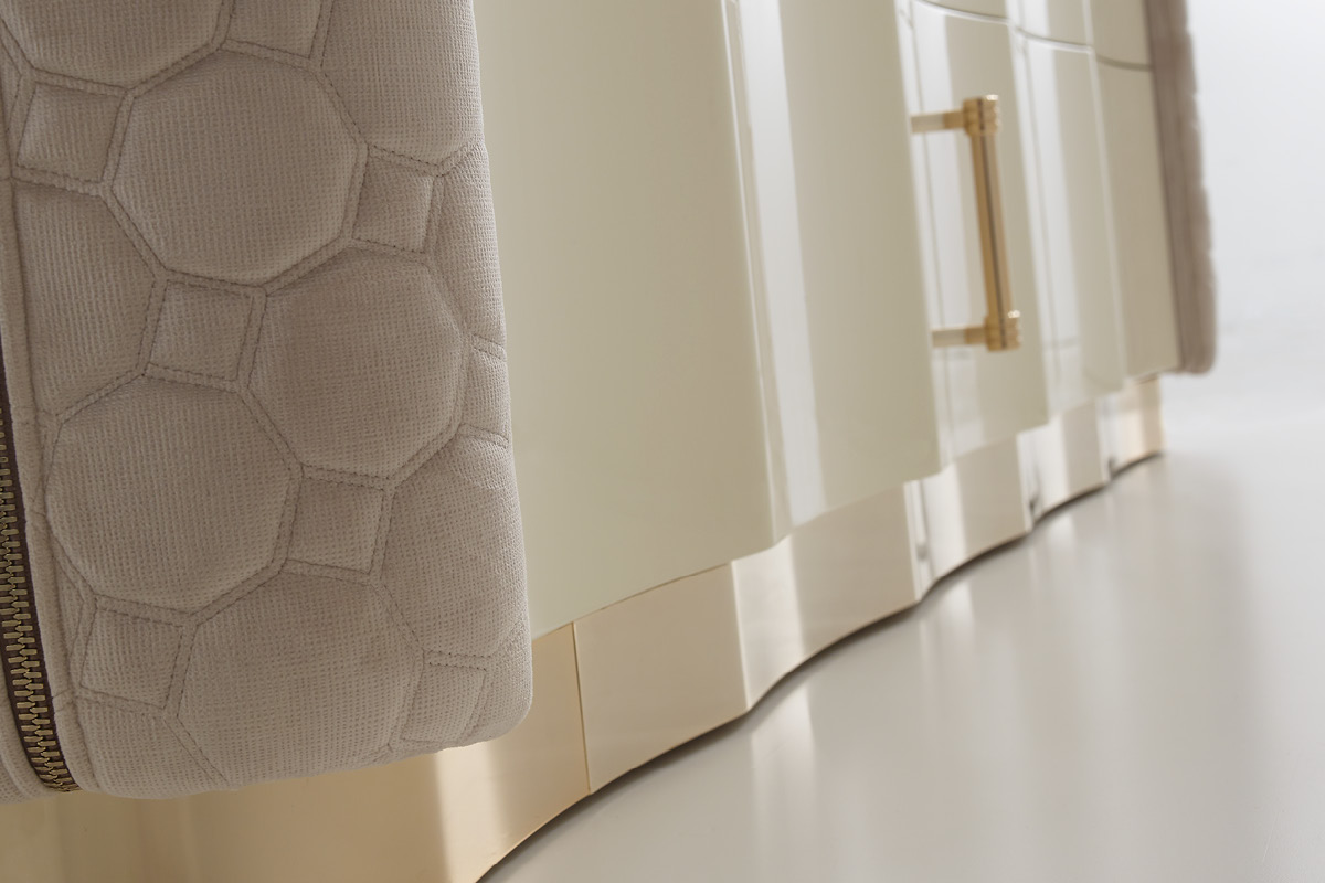 Mobile in legno.I frontali dei cassetti realizzati in essenza o in legno laccato. Cassetti con interni imbottiti e chiusura soft. Fianchi curvi in legno rivestiti in pelle. Base mossa in metallo. Il piano superiore può essere in essenza, legno laccato o gres.