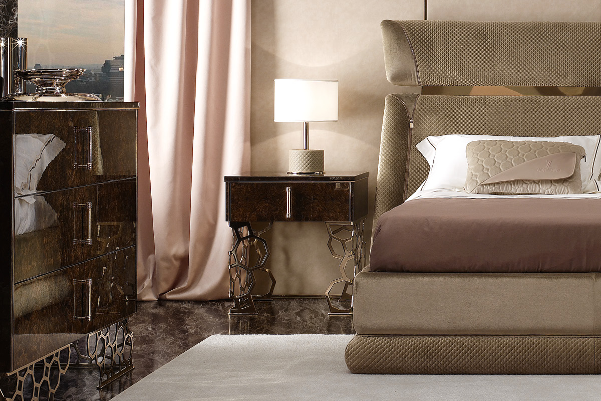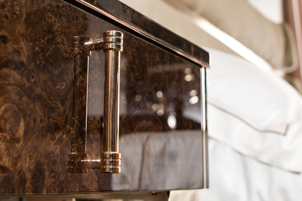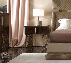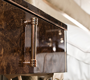 Mobile in legno disponibile con tre cassetti oppure con un cassetto. Può essere realizato in essenza oppure laccato. Casssetti con interni imbottiti e chiusura soft. Il piano superiore può essere in essenza, laccato o in gres. La base in metallo ha un originale disegno geometrico.