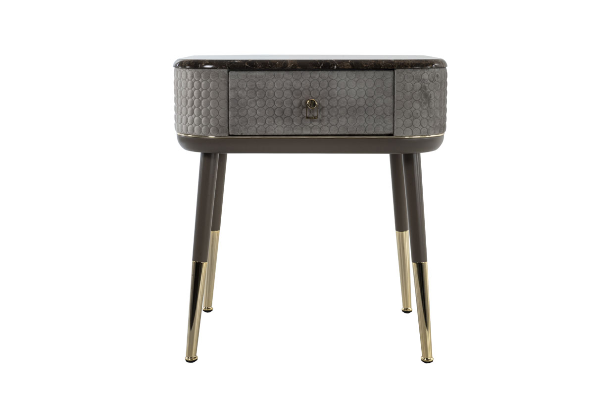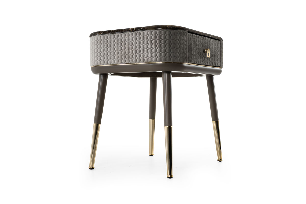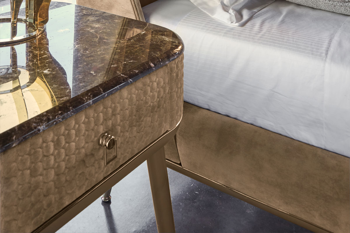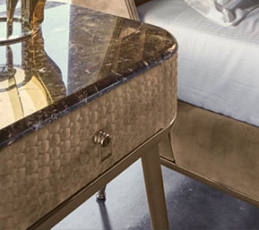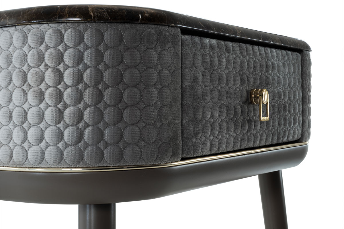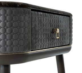 Mobile in legno con un cassetto. Realizzato in compensato curvo. Telaio con gambe in massello di canaletto o laccato. Parte centrale rivestita in tessuto o in pelle. Puntali in metallo. Piano in essenza, laccato o gres. Cassetto con interno imbottito e chiusura soft. Questo articolo non รจ disponibile in essenza Mirto.