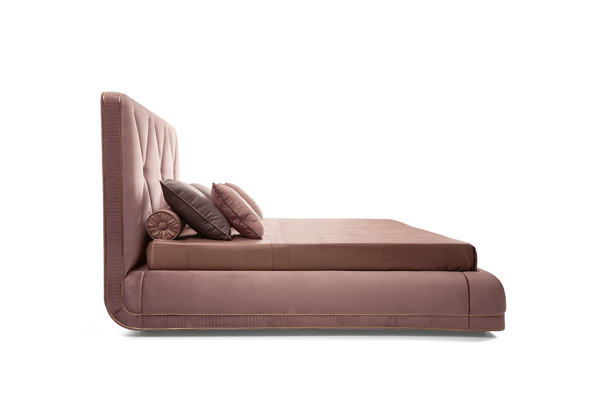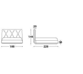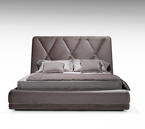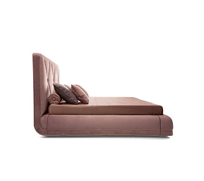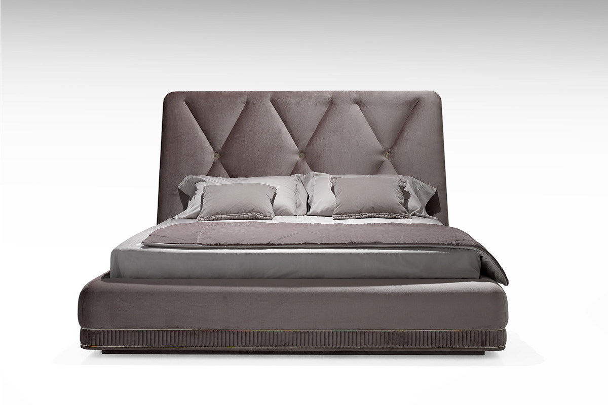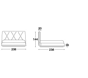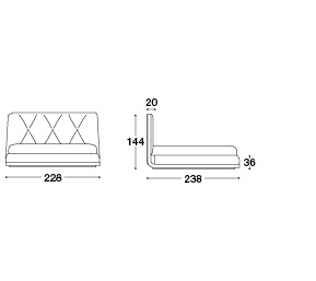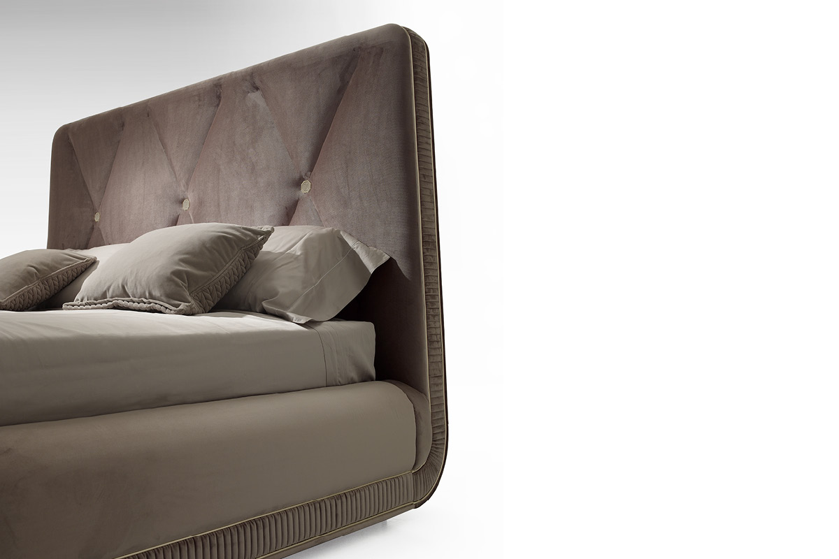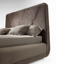 Struttura in legno completamente rivestita in tessuto o pelle. Lavorazione perimetrale con inserti in pelle effetto cromo. Testata con bottoni in ottone