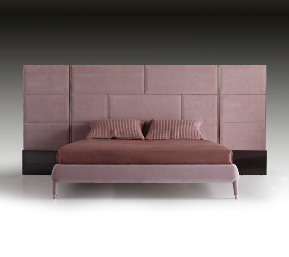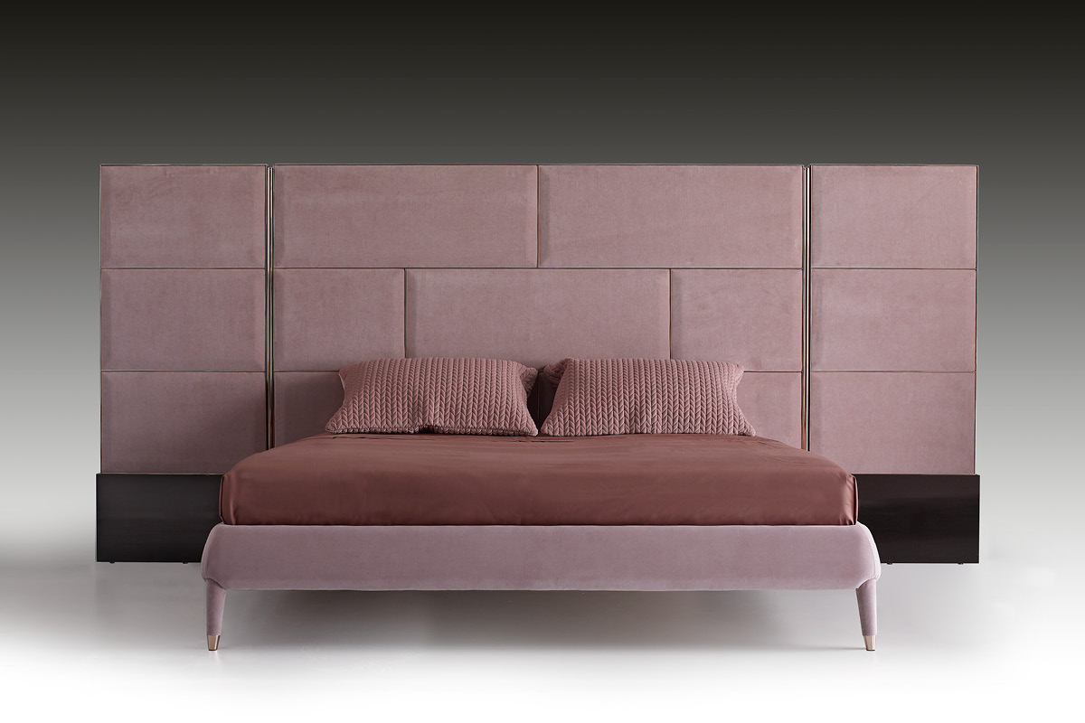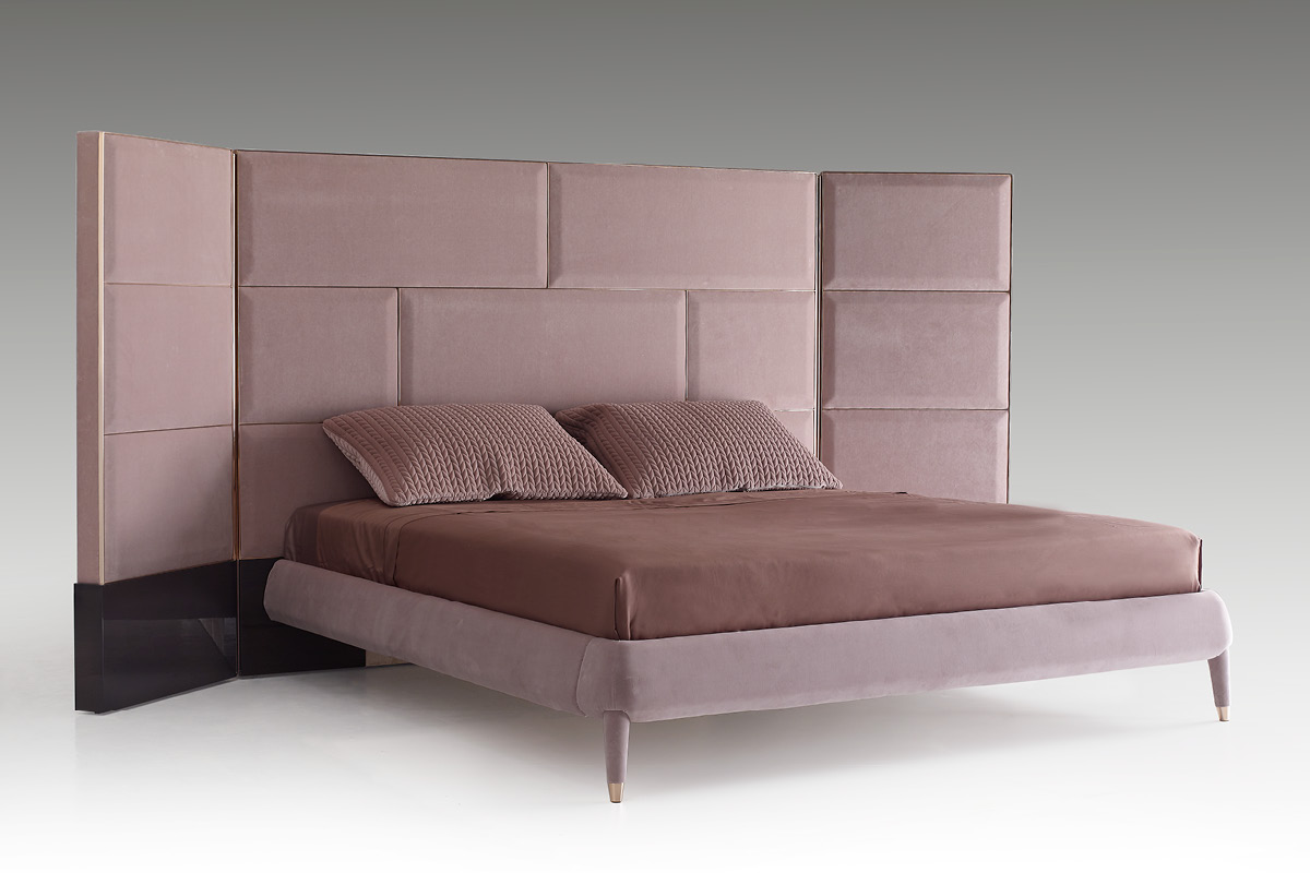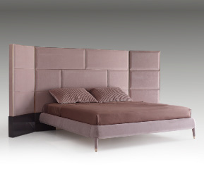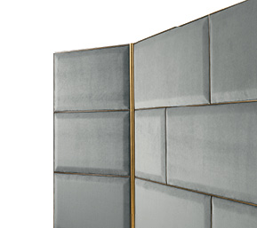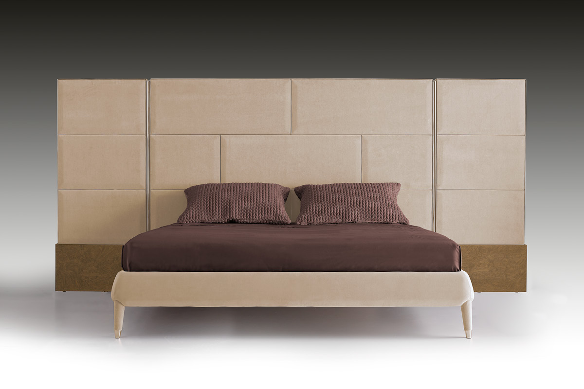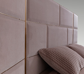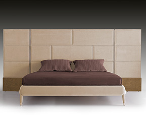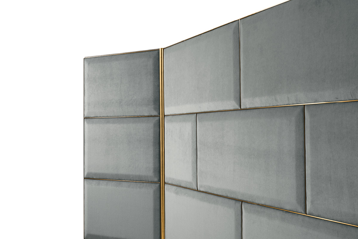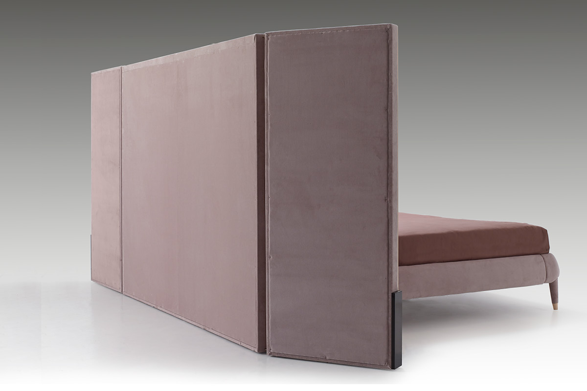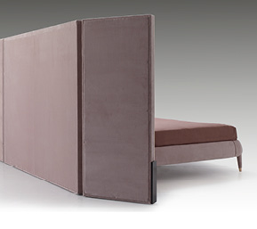 Struttura in compensato di legno con inserimento di pannelli frontali e posteriori in compensato di legno laccati o in essenza nella parte inferiore e imbottita in tessuto o pelle nella parte superiore. Profili in metallo, con cerniere per movimento pannelli laterali.