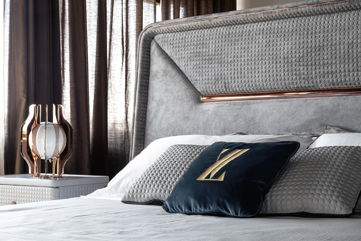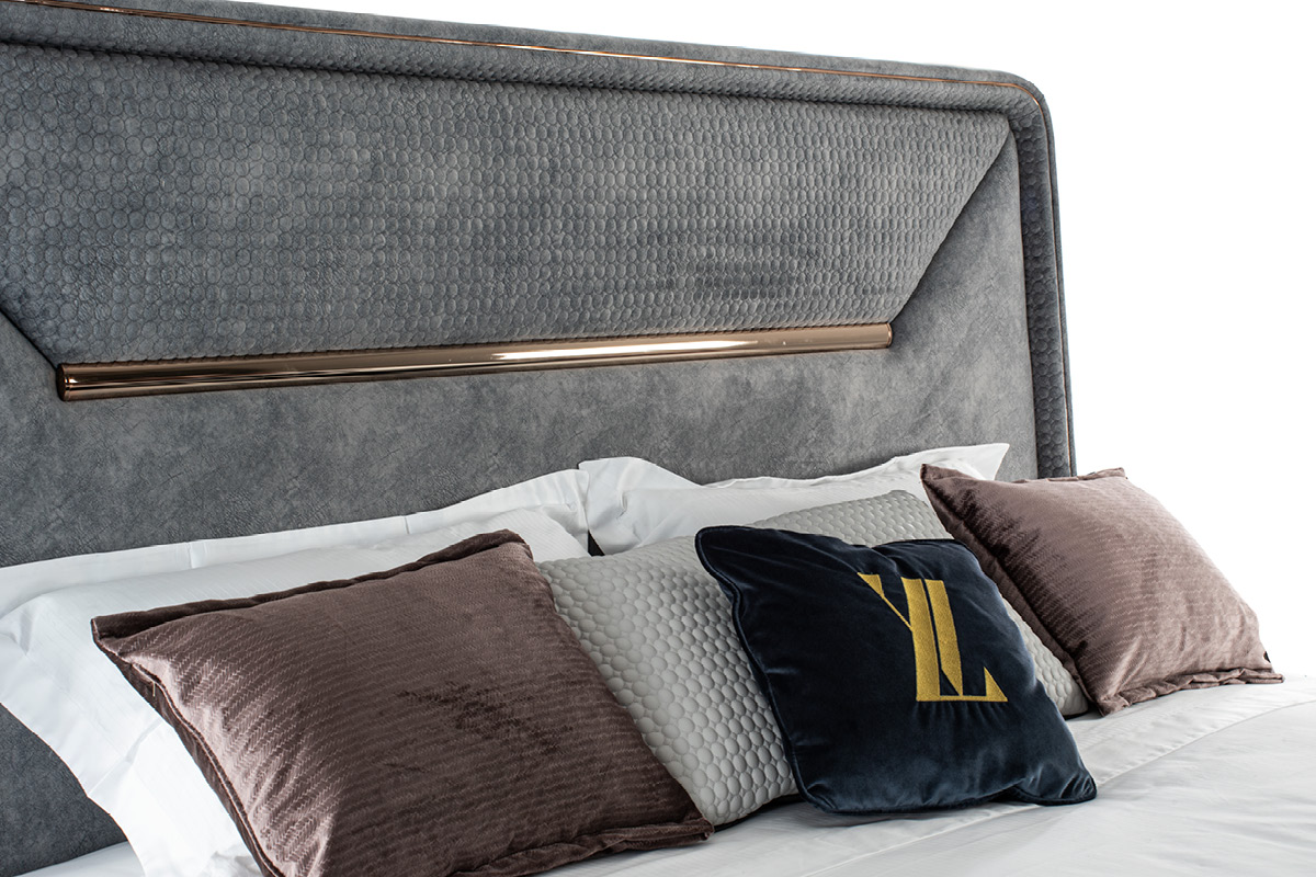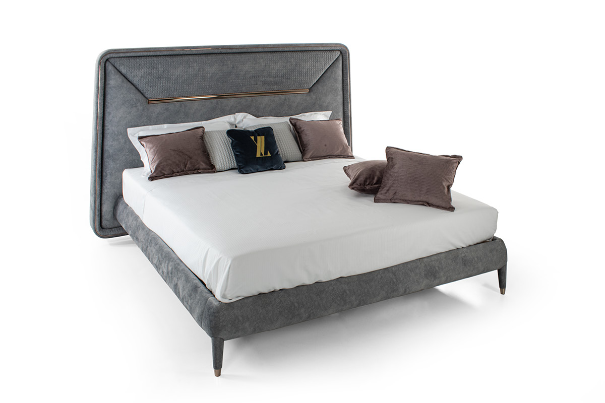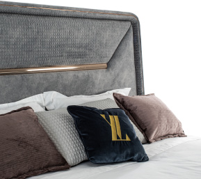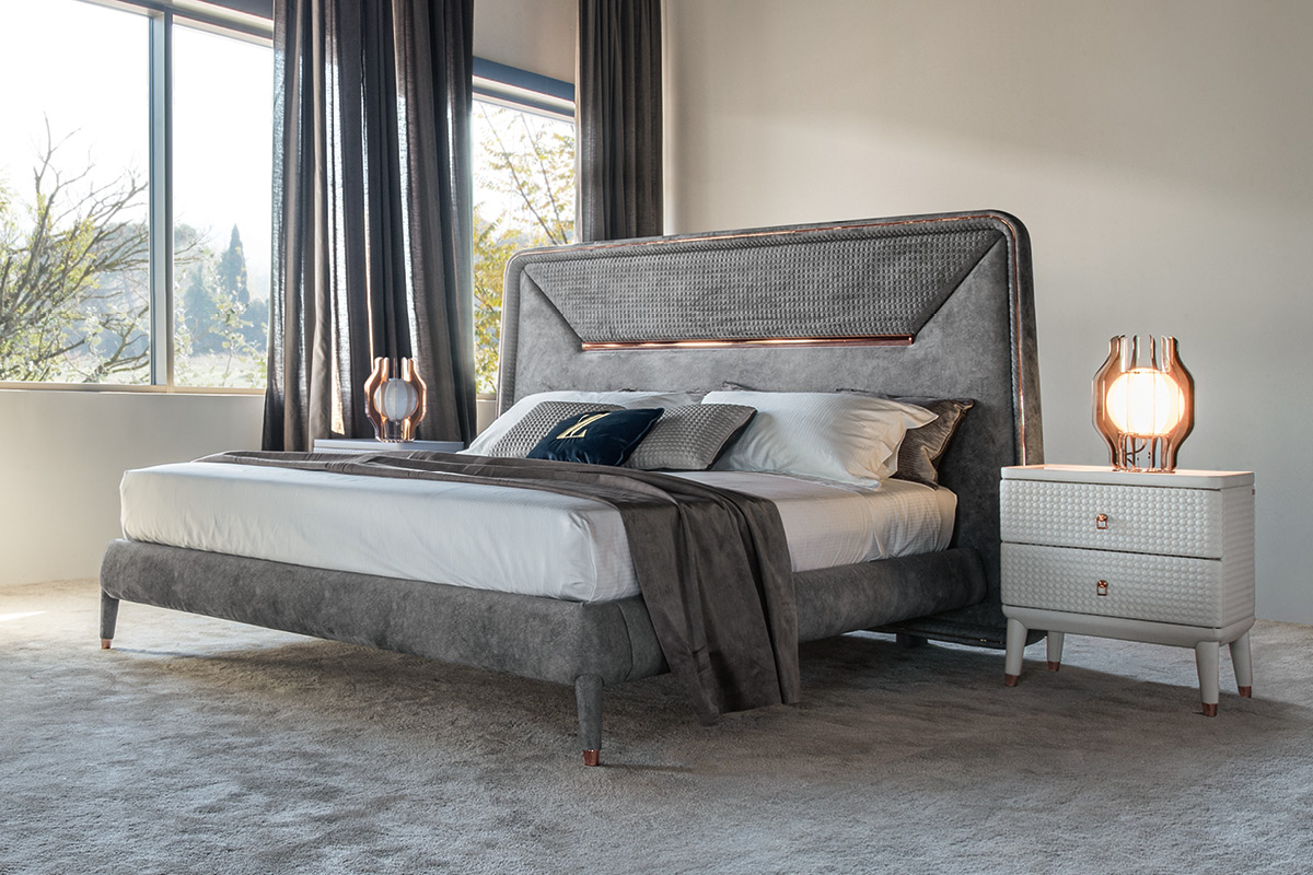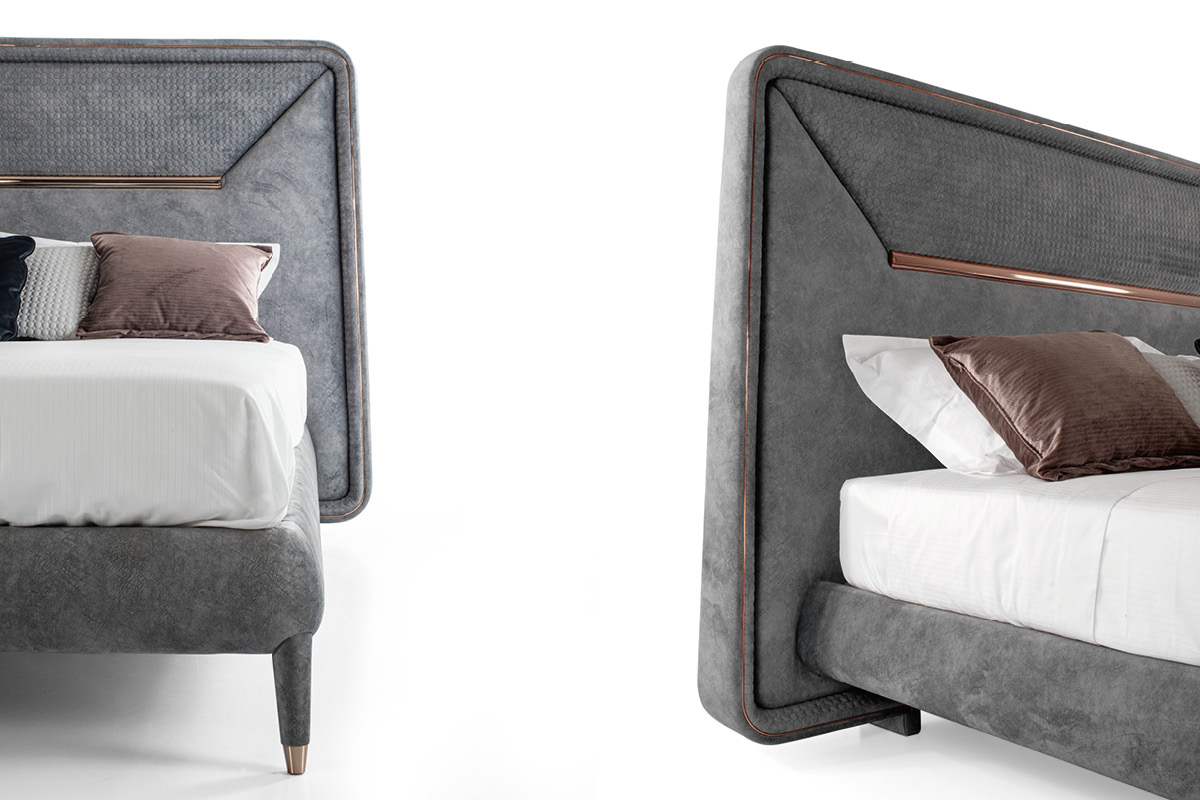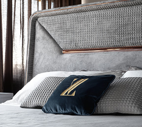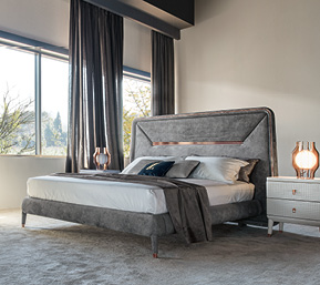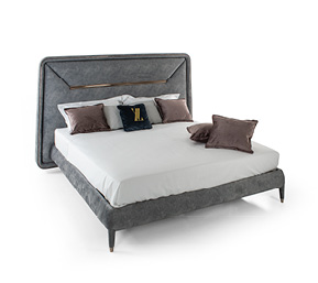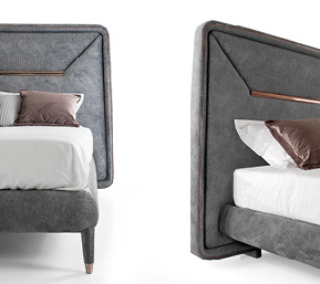 Struttura in compensato di legno rivestito in tessuto o pelle, con imbottitura in diverse densità . Base completamente imbottita, particolari in metallo.